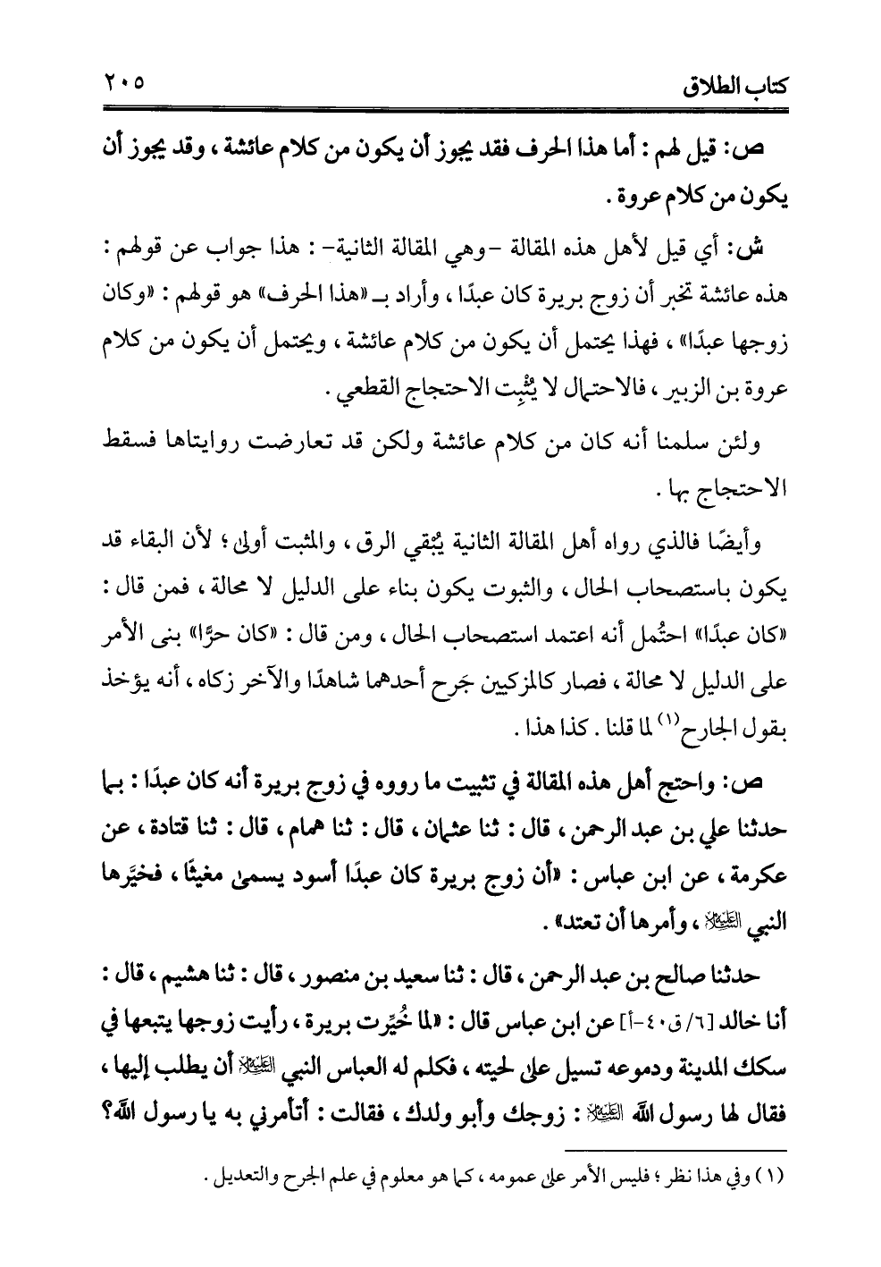 حدثنا صالح بن عبد الرحمن، قال: ثنا سعيد بن منصور، قال: ثنا هشيم، قال: أنا خالد عن ابن عباس قال: "لما خُيِّرت بريرة، رأيت زوجها يتبعها في سكك المدينة ودموعه تسيل على لحيته، فكلم له العباس النبي -عليه السلام- أن يطلب إليها، فقال لها رسول الله -عليه السلام-: زوجك وأبو ولدك، فقالت: أتأمرني به يا رسول الله؟