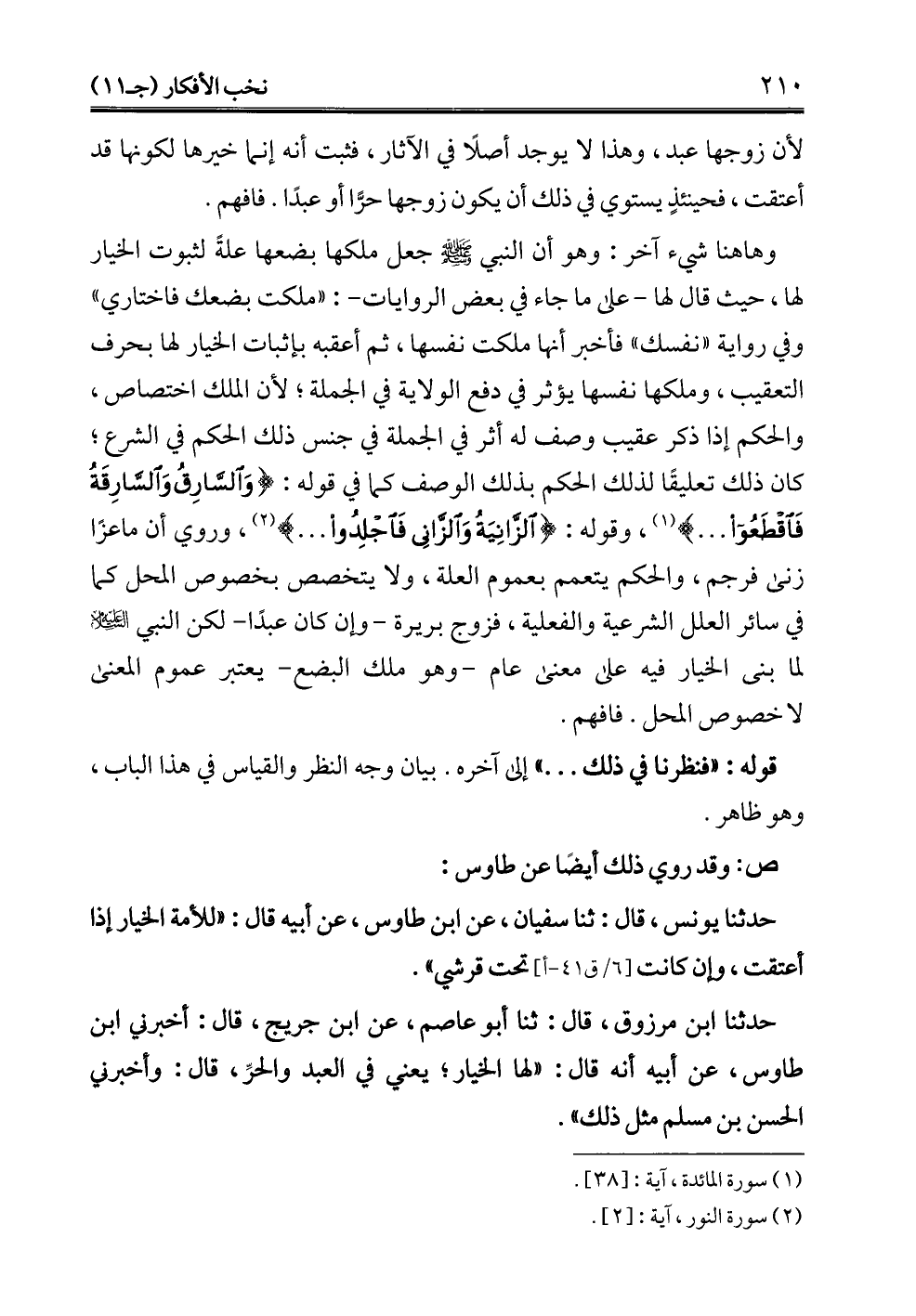 وها هنا شيء آخر: وهو أن النبي - صلى الله عليه وسلم - جعل ملكها بضعها علةً لثبوت الخيار لها، حيث قال لها -على ما جاء في بعض الروايات-: "ملكت بضعك فاختاري" وفي رواية "نفسك" فأخبر أنها ملكت نفسها، ثم أعقبه بإثبات الخيار لها بحرف التعقيب، وملكها نفسها يؤثر في دفع الولاية في الجملة؛ لأن الملك اختصاص، والحكم إذا ذكر عقيب وصف له أثر في الجملة في جنس ذلك الحكم في الشرع؛ كان ذلك تعليقًا لذلك الحكم بذلك الوصف كما في قوله: {وَالسَّارِقُ وَالسَّارِقَةُ فَاقْطَعُوا ...} (¬1)، وقوله: {لزَّانِيَةُ وَالزَّانِي فَاجْلِدُوا ...} (¬2)، وروي أن ماعزًا زنى فرجم، والحكم يتعمم بعموم العلة، ولا يتخصص بخصوص المحل كما في سائر العلل الشرعية والفعلية، فزوج بريرة -وإن كان عبدًا- لكن النبي -عليه السلام- لما بني الخيار فيه على معنى عام -وهو ملك البضع- يعتبر عموم المعنى لا خصوص المحل. فافهم.