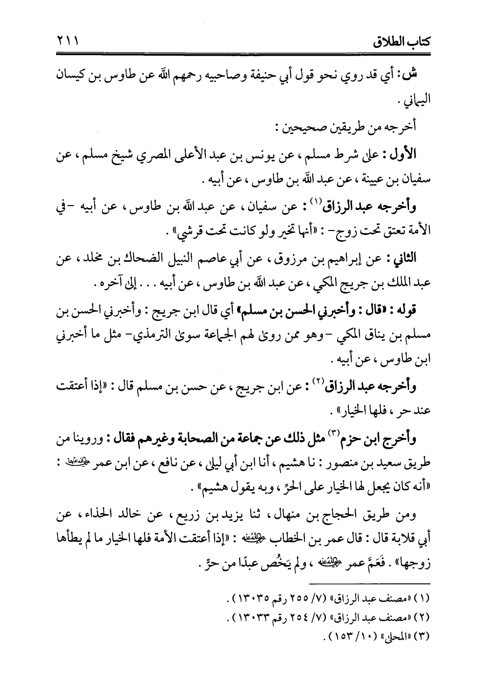 وأخرجه عبد الرزاق (¬2): عن ابن جريج، عن حسن بن مسلم قال: "إذا أعتقت عند حر، فلها الخيار". وأخرج ابن حزم (¬3) مثل ذلك عن جماعة من الصحابة وغيرهم فقال: وروينا من طريق سعيد بن منصور: نا هشيم، أنا ابن أبي ليلى، عن نافع، عن ابن عمر -رضي الله عنهما-: "أنه كان يجعل لها الخيار على الحرِّ، وبه يقول هشيم".