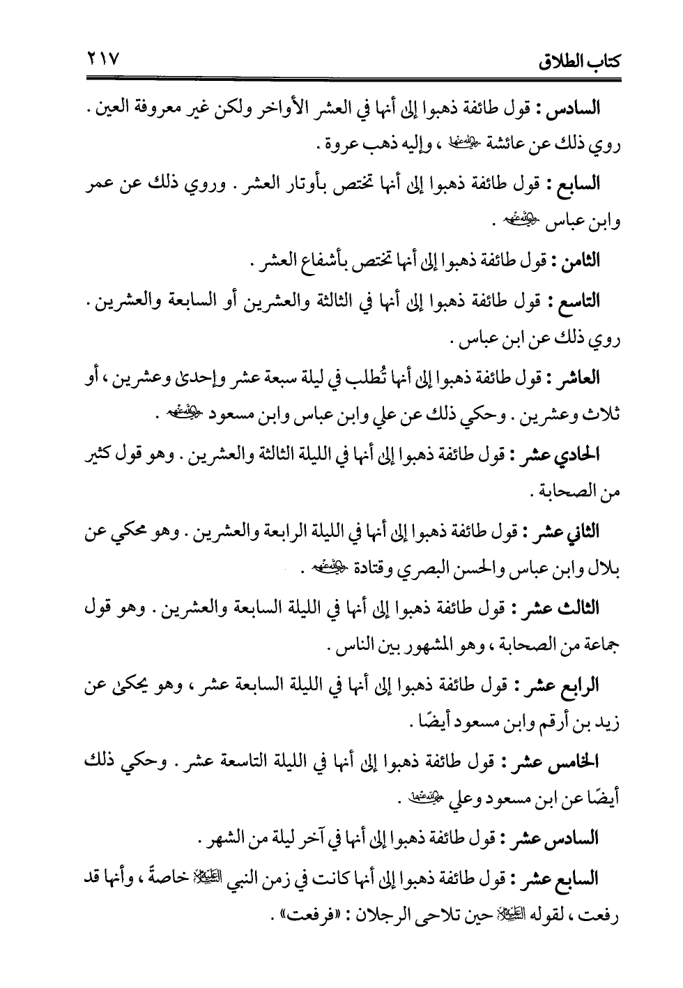 العاشر: قول طائفة ذهبوا إلى أنها تُطلب في ليلة سبعة عشر وإحدى وعشرين، أو ثلاث وعشرين. وحكي ذلك عن علي وابن عباس وإبن مسعود -رضي الله عنهم-.