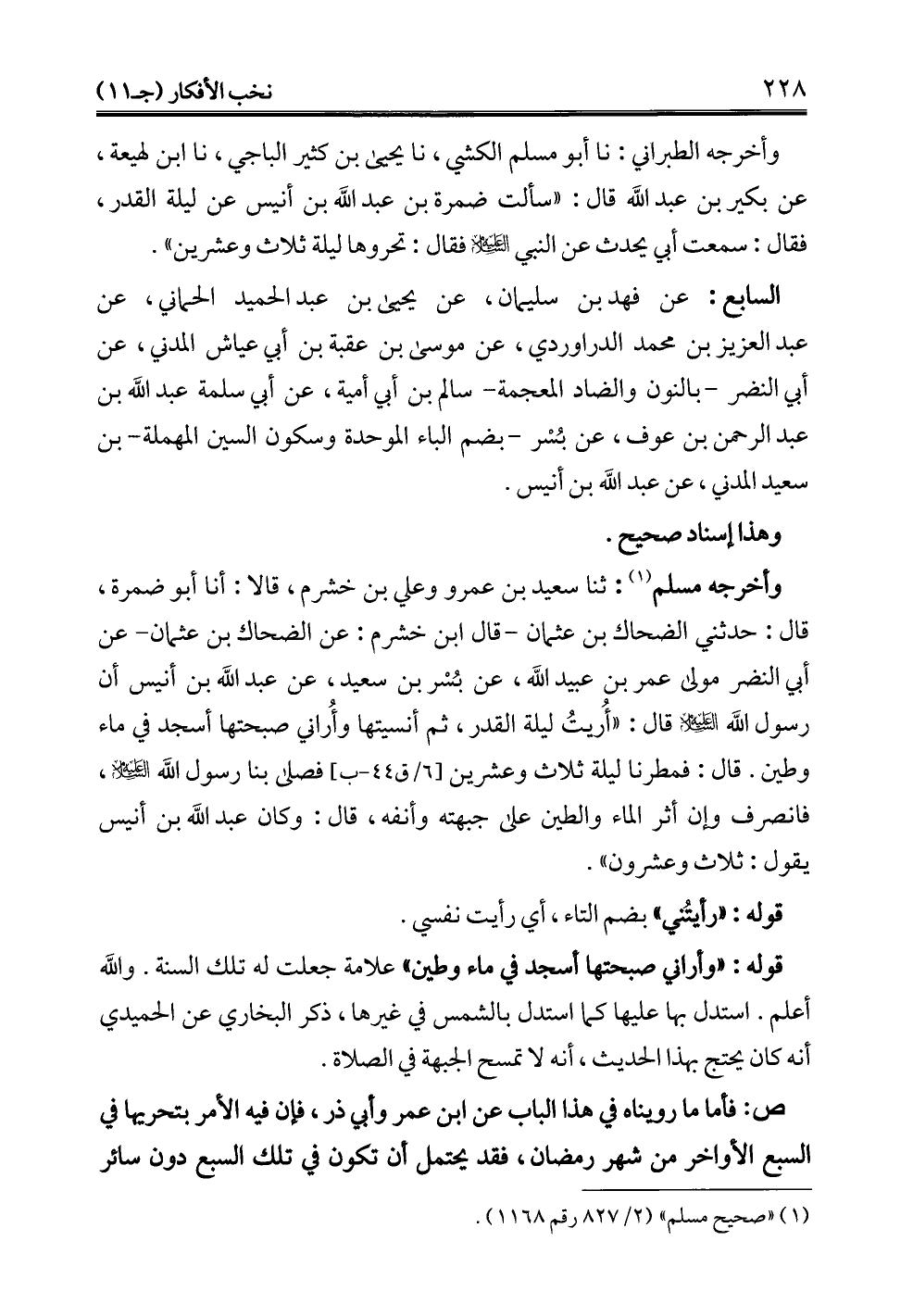 وأخرجه مسلم (¬1): ثنا سعيد بن عمرو وعلي بن خشرم، قالا: أنا أبو ضمرة، قال: حدثني الضحاك بن عثمان -قال ابن خشرم: عن الضحاك بن عثمان- عن أبي النضر مولى عمر بن عبيد الله، عن بُسْر بن سعيد، عن عبد الله بن أنيس أن رسول الله -عليه السلام- قال: "أُريتُ ليلة القدر، ثم أنسيتها وأُراني صبحتها أسجد في ماء وطين. قال: فمطرنا ليلة ثلاث وعشرين فصلى بنا رسول الله -عليه السلام-، فانصرف وإن أثر الماء والطين على جبهته وأنفه، قال: وكان عبد الله بن أنيس يقول: ثلاث وعشرون".