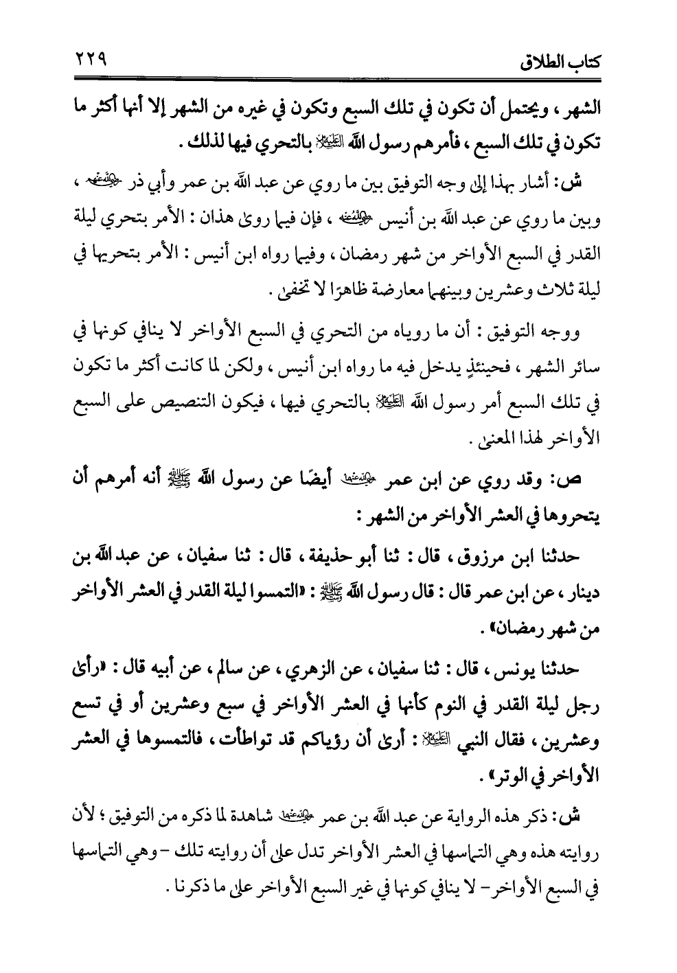 ش: ذكر هذه الرواية عن عبد الله بن عمر -رضي الله عنهما- شاهدة لما ذكره من التوفيق؛ لأن روايته هذه وهي التماسها في العشر الأواخر تدل على أن روايته تلك -وهي التماسها في السبع الأواخر- لا ينافي كونها في غير السبع الأواخر على ما ذكرنا.