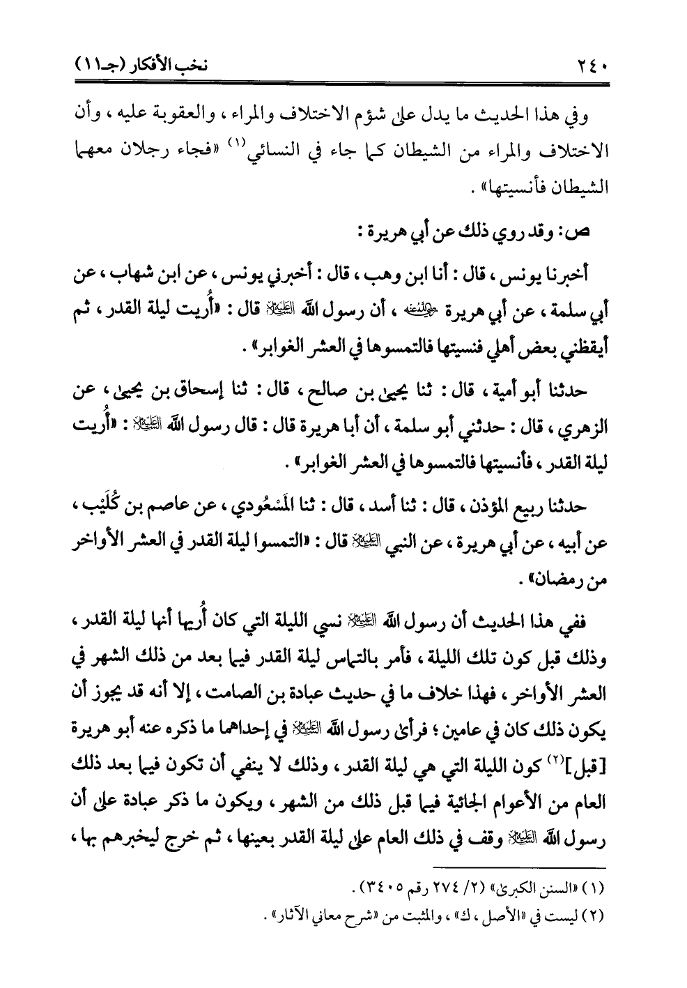 أخبرنا يونس، قال: أنا ابن وهب، قال: أخبرني يونس، عن ابن شهاب، عن أبي سلمة، عن أبي هريرة -رضي الله عنه-، أن رسول الله -عليه السلام- قال: "أُريت ليلة القدر، ثم أيقظني بعض أهلي فنسيتها فالتمسوها في العشر الغوابر".