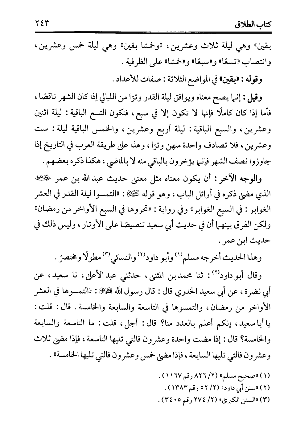 وقيل: إنما يصح معناه ويوافق ليلة القدر وترًا من الليالي إذا كان الشهر ناقصًا، فأما إذا كان كاملًا فإنها لا تكون إلا في سبع، فتكون التسع الباقية: ليلة اثنين وعشرين، والسبع الباقية: ليلة أربع وعشرين، والخمس الباقية ليلة: ست وعشرين، فلا تصادف واحدة منهن وترًا، وهذا على طريقة العرب في التاريخ إذا جاوزوا نصف الشهر فإنما يؤخرون بالباقي منه لا بالماضي، هكذا ذكره بعضهم.
