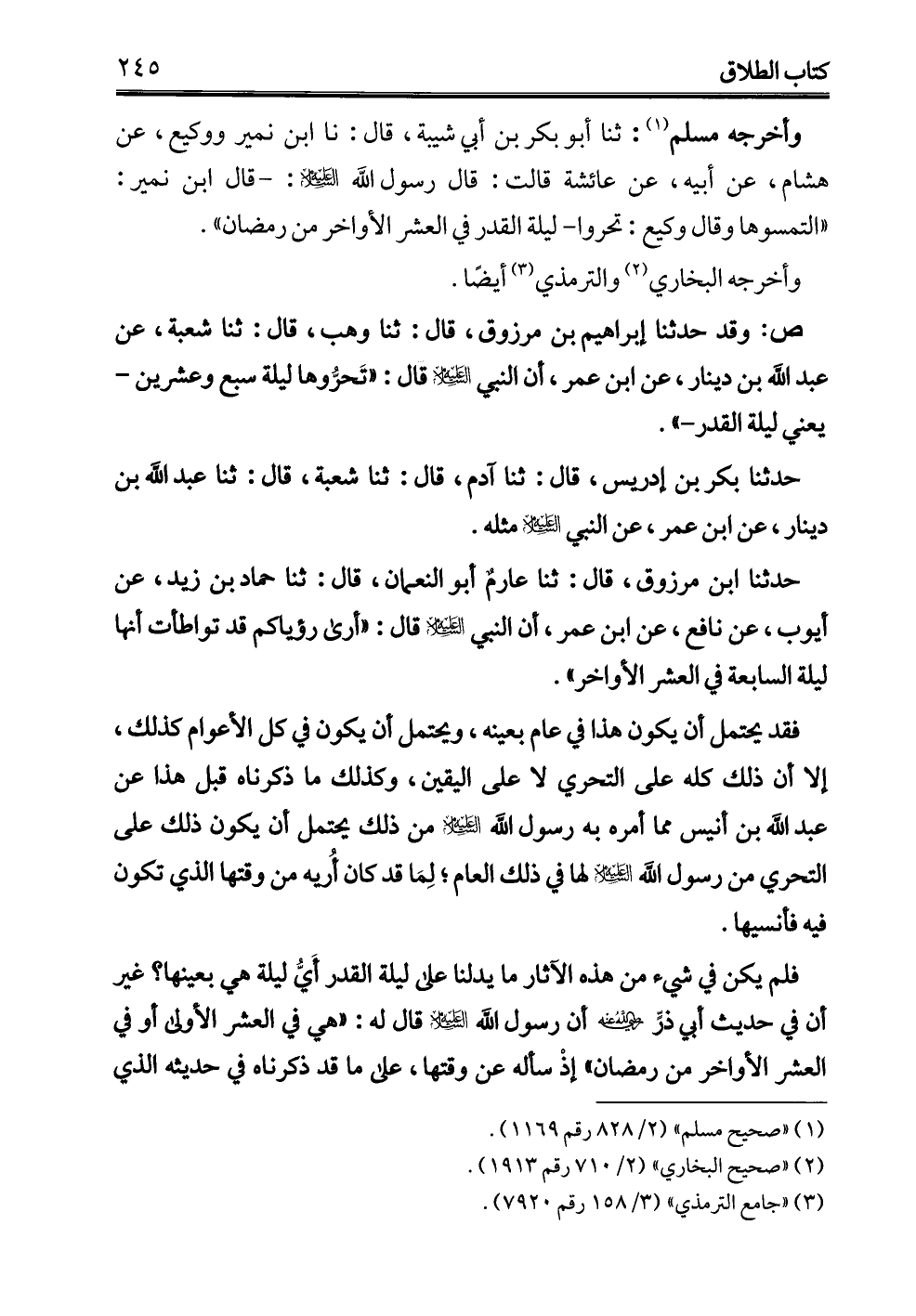 ص: وقد حدثنا إبراهيم بن مرزوق، قال: ثنا وهب، قال: ثنا شعبة، عن عبد الله بن دينار، عن ابن عمر، أن النبي -عليه السلام- قال: "تَحرُّوها ليلة سبع وعشرين -يعني ليلة القدر-".