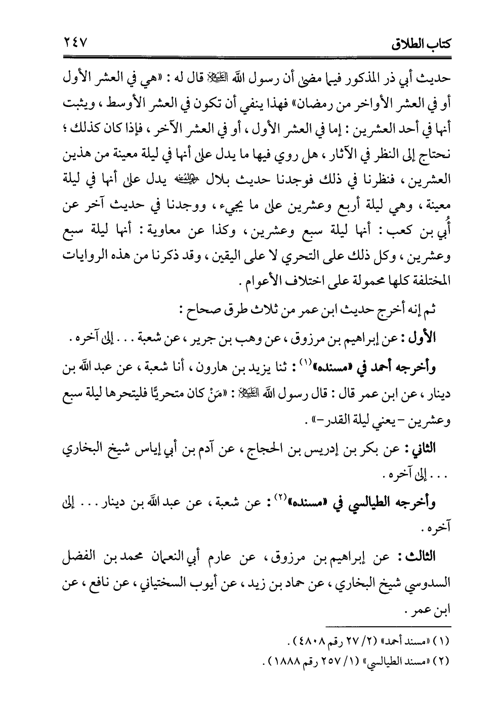 حديث أبي ذر المذكور فيما مضى أن رسول الله -عليه السلام- قال له: "هي في العشر الأول أو في العشر الأواخر من رمضان" فهذا ينفي أن تكون في العشر الأوسط، ويثبت أنها في أحد العشرين: إما في العشر الأول، أو في العشر الآخر، فإذا كان كذلك؛ نحتاج إلى النظر في الآثار، هل روي فيها ما يدل على أنها في ليلة معينة من هذين العشرين، فنظرنا في ذلك فوجدنا حديث بلال -رضي الله عنه- يدل على أنها في ليلة معينة، وهي ليلة أربع وعشرين على ما يجيء، ووجدنا في حديث آخر عن أُبي بن كعب: أنها ليلة سبع وعشرين، وكذا عن معاوية: أنها ليلة سبع وعشرين، وكل ذلك على التحري لا على اليقين، وقد ذكرنا من هذه الروايات المختلفة كلها محمولة على اختلاف الأعوام.