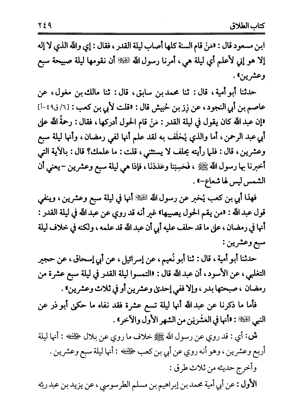 حدثنا أبو أمية، قال: ثنا محمد بن سابق، قال: ثنا مالك بن مغول، عن عاصم بن أبي النجود، عن زِرّ بن حُبَيش قال: "قلت لأبي بن كعب: "إن عبد الله كان يقول في ليلة القدر: مَنْ قام الحول أدركها، فقال: رحمةُ الله على أي عبد الرحمن، أما والذي يُحْلَف به لقد علم أنها لفي رمضان، وأنها ليلة سبع وعشرين، قال: فلما رأيته يحلف لا يستثني، قلت: ما علمك قال: بالآية التي أخبرنا بها رسول الله - صلى الله عليه وسلم -، فَحَسبْنا وعَدَدْنَا، فإذا هي ليلة سبع وعشرين -يعني أن الشمس ليس لها شعاع-".