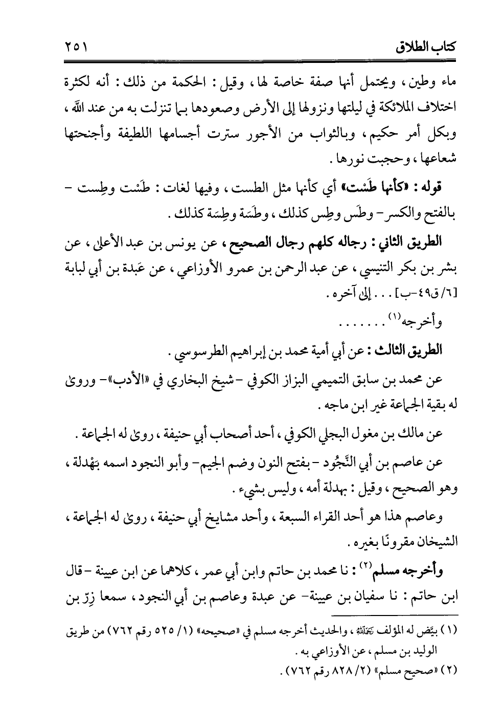 وأخرجه مسلم (¬2): نا محمد بن حاتم وابن أبي عمر، كلاهما عن ابن عيينة -قال ابن حاتم: نا سفيان بن عيينة- عن عبدة وعاصم بن أبي النجود، سمعا زِرّ بن
