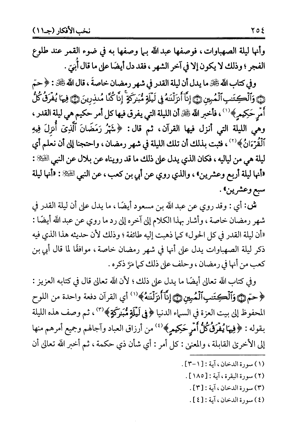وفي كتاب الله -عز وجل- ما يدل أن ليلة القدر في شهر رمضان خاصةً، قال الله -عز وجل-: {حم (1) وَالْكِتَابِ الْمُبِينِ (2) إِنَّا أَنْزَلْنَاهُ فِي لَيْلَةٍ مُبَارَكَةٍ إِنَّا كُنَّا مُنْذِرِينَ (3) فِيهَا يُفْرَقُ كُلُّ أَمْرٍ حَكِيمٍ} (¬1)، فأخبر الله -عز وجل- أن الليلة التي يفرق فيها كل أمر حكيم هي ليلة القدر، وهي الليلة التي أنزل فيها القرآن، ثم قال: {شَهْرُ رَمَضَانَ الَّذِي أُنْزِلَ فِيهِ الْقُرْآنُ} (¬2)، فثبت بذلك أن تلك الليلة في شهر رمضان، واحتجنا إلى أن نعلم أي ليلة هي من لياليه، فكان الذي يدل على ذلك ما قد رويناه عن بلال عن النبي -عليه السلام-: "أنها ليلة أربع وعشرين"، والذي روي عن أبي بن كعب، عن النبي -عليه السلام-: أنها ليلة سبع وعشرين".