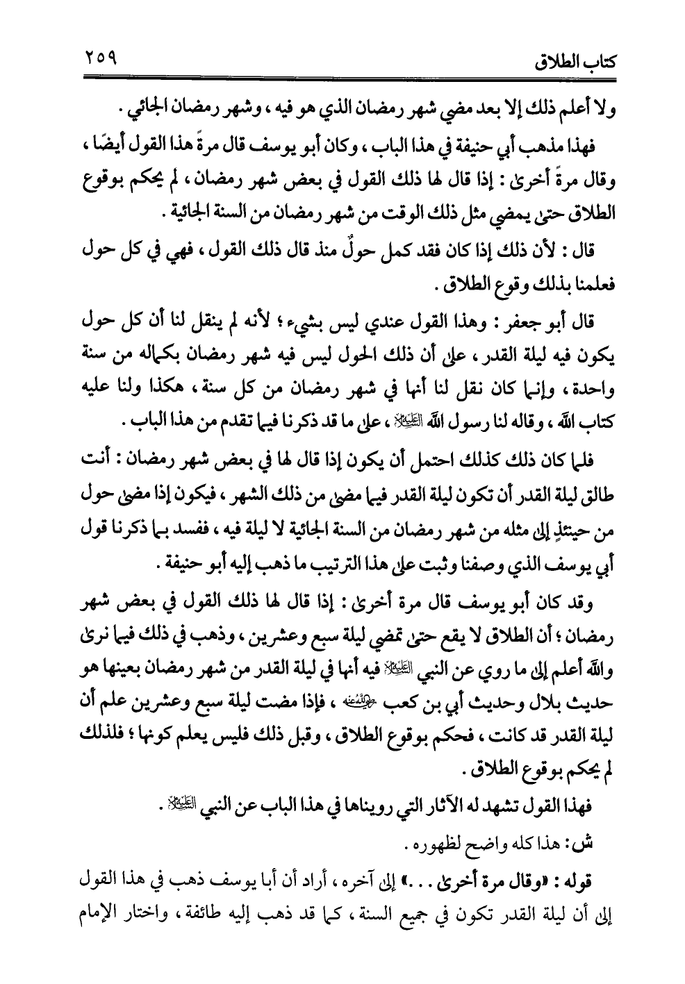 وقد كان أبو يوسف قال مرة أخرى: إذا قال لها ذلك القول في بعض شهر رمضان؛ أن الطلاق لا يقع حتى تمضي ليلة سبع وعشرين، وذهب في ذلك فيما نرى والله أعلم إلى ما روي عن النبي -عليه السلام- فيه أنها في ليلة القدر من شهر رمضان بعينها هو حديث بلال وحديث أبي بن كعب -رضي الله عنه-، فإذا مضت ليلة سبع وعشرين علم أن ليلة القدر قد كانت، فحكم بوقوع الطلاق، وقبل ذلك فليس يعلم كونها؛ فلذلك لم يحكم بوقوع الطلاق.