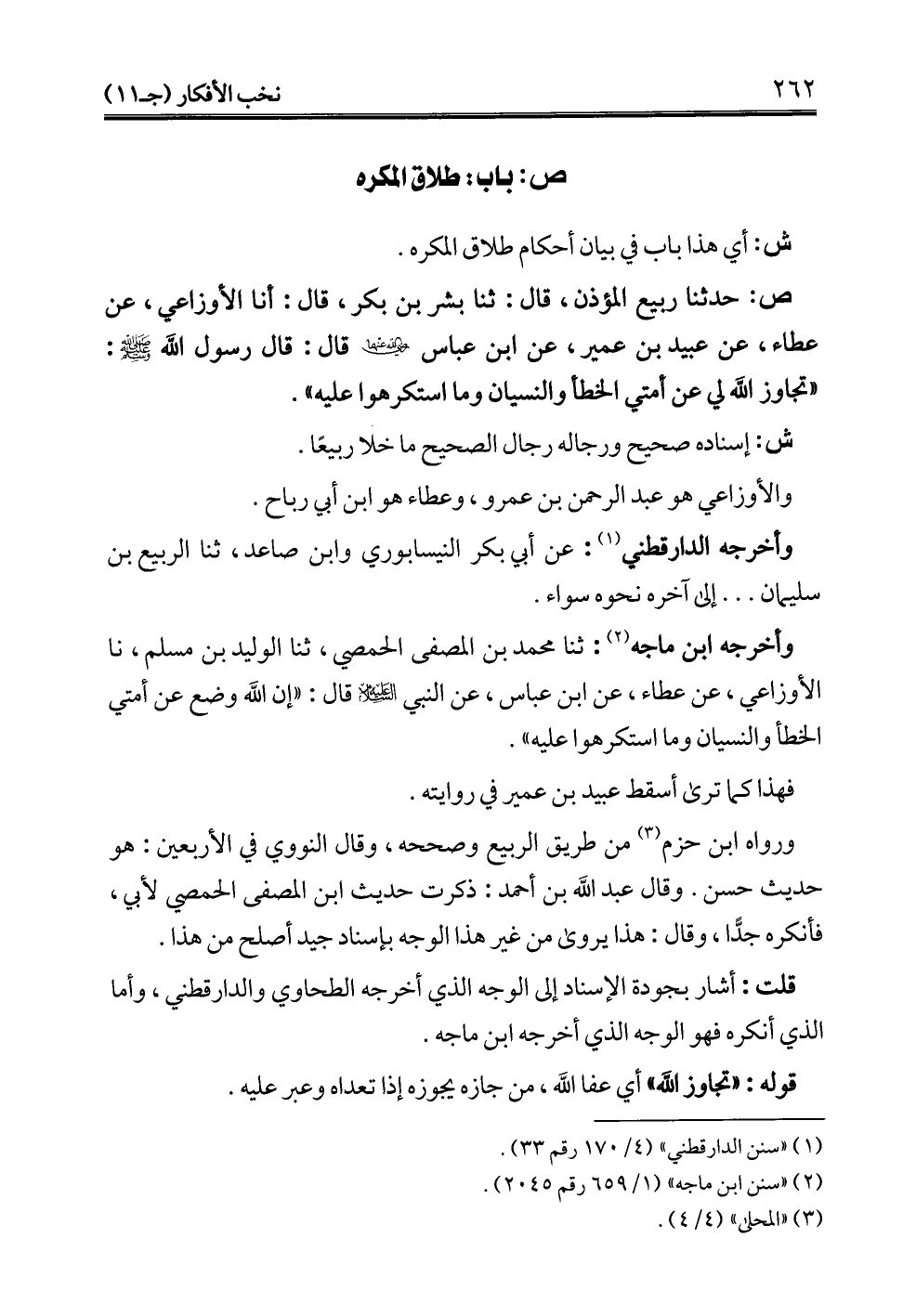 ص: حدثنا ربيع المؤذن، قال: ثنا بشر بن بكر، قال: أنا الأوزاعي، عن عطاء، عن عبيد بن عمير، عن ابن عباس -رضي الله عنهما- قال: قال رسول الله - صلى الله عليه وسلم -: "تجاوز الله لي عن أمتي الخطأ والنسيان وما استكرهوا عليه".