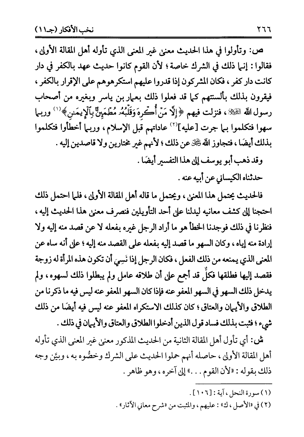 ص: وتأولوا في هذا الحديث معنى غير المعنى الذي تأوله أهل المقالة الأولى، فقالوا: إنما ذلك في الشرك خاصة؛ لأن القوم كانوا حديث عهد بالكفر في دار كانت دار كفر، فكان المشركون إذا قدروا عليهم استكرهوهم على الإقرار بالكفر، فيقرون بذلك بألسنتهم كما قد فعلوا ذلك بعمار بن ياسر وبغيره من أصحاب رسول الله -عليه السلام-، فنزلت فيهم {إِلَّا مَنْ أُكْرِهَ وَقَلْبُهُ مُطْمَئِنٌّ بِالْإِيمَانِ} (¬1) وربما سهوا فتكلموا بما جرت [عليه] (¬2) عاداتهم قبل الإِسلام، وربما أخطأوا فتكلموا بذلك أيضًا، فتجاوز الله -عز وجل- عن ذلك؛ لأنهم غير مختارين ولا قاصدين إليه.