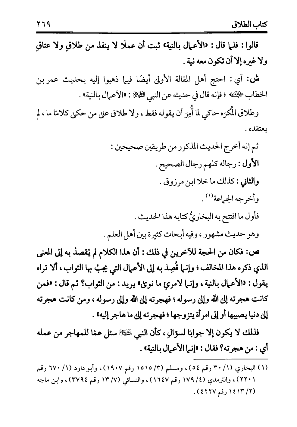 ص: فكان من الحجة للآخرين في ذلك: أن هذا الكلام لم يُقصدْ به إلى المعنى الذي ذكره هذا المخالف؛ وإنما قُصِدَ به إلى الأعمال التي يجبُ بها الثواب، ألا تراه يقول: "الأعمال بالنية، وإنما لامرئٍ ما نوى" يريد: من الثواب؟ ثم قال: "فمن كانت هجرته إلى الله وإلى رسوله؛ فهجرته إلى الله وإلى رسوله، ومن كانت هجرته إلى دنيا يصيبها أو إلى امرأة يتزوجها. فهجرته إلى ما هاجر إليه".