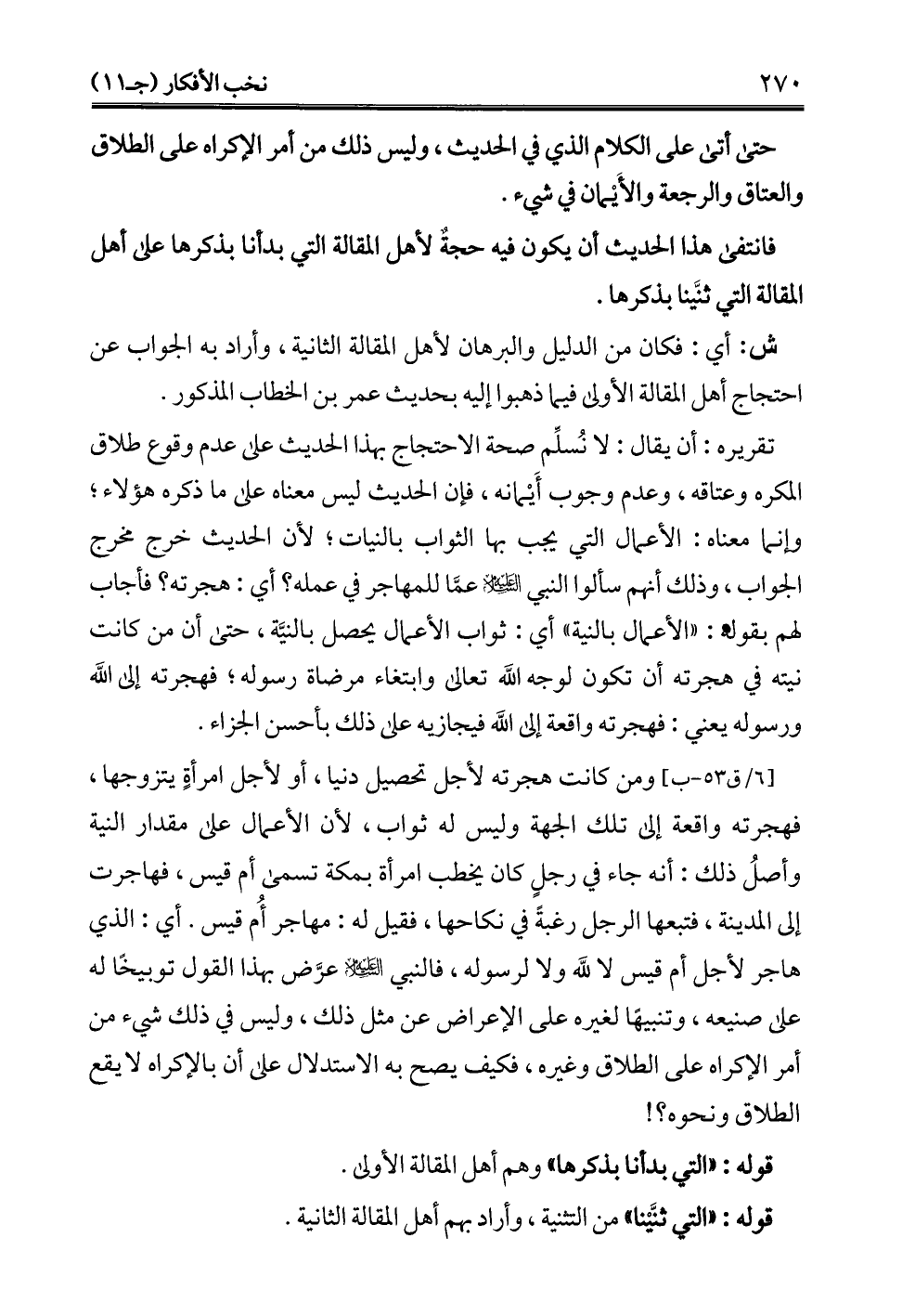 تقريره: أن يقال: لا نُسلِّم صحة الاحتجاج بهذا الحديث على عدم وقوع طلاق المكره وعتاقه، وعدم وجوب أَيْمانه، فإن الحديث ليس معناه على ما ذكره هؤلاء؛ وإنما معناه: الأعمال التي يجب بها الثواب بالنيات؛ لأن الحديث خرج مخرج الجواب، وذلك أنهم سألوا النبي -عليه السلام- عمَّا للمهاجر في عمله؟ أي: هجرته؟ فأجاب لهم بقوله: "الأعمال بالنية" أي: ثواب الأعمال يحصل بالنيَّة، حتى أن من كانت نيته في هجرته أن تكون لوجه الله تعالى، وابتغاء مرضاة رسوله؛ فهجرته إلى الله ورسوله يعني: فهجرته واقعة إلى الله فيجازيه على ذلك بأحسن الجزاء.