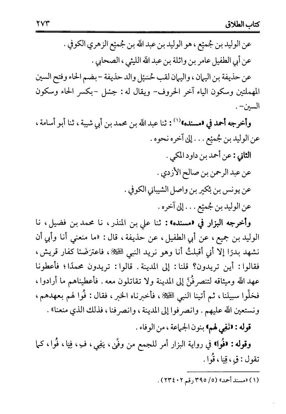 وأخرجه البزار في "مسنده": ثنا علي بن المنذر، نا محمد بن فضيل، نا الوليد بن جميع، عن أبي الطفيل، عن حذيفة، قال: "ما منعني أنا وأبي أن نشهد بدرًا إلا أني أقبلتُ أنا وهو نريد النبي -عليه السلام-، فاعترَضَنَا كفار قريش، فقالوا: أين تريدون؟ قلنا: إلى المدينة. قالوا: تريدون محمدًا؛ فأعطونا عهد الله وميثاقه لتنصرفُنَّ إلى المدينة ولا تقاتلون معه. فأعطيناهم ما أرادوا، فخلَّوا سبيلنا، ثم أتينا النبي -عليه السلام-، فأخبرناه الخبر، فقال: فُوا لهم بعهدهم، ونستعين الله عليهم. وانصرفوا إلى المدينة، وانصرفنا، فذلك الذي منعنا".