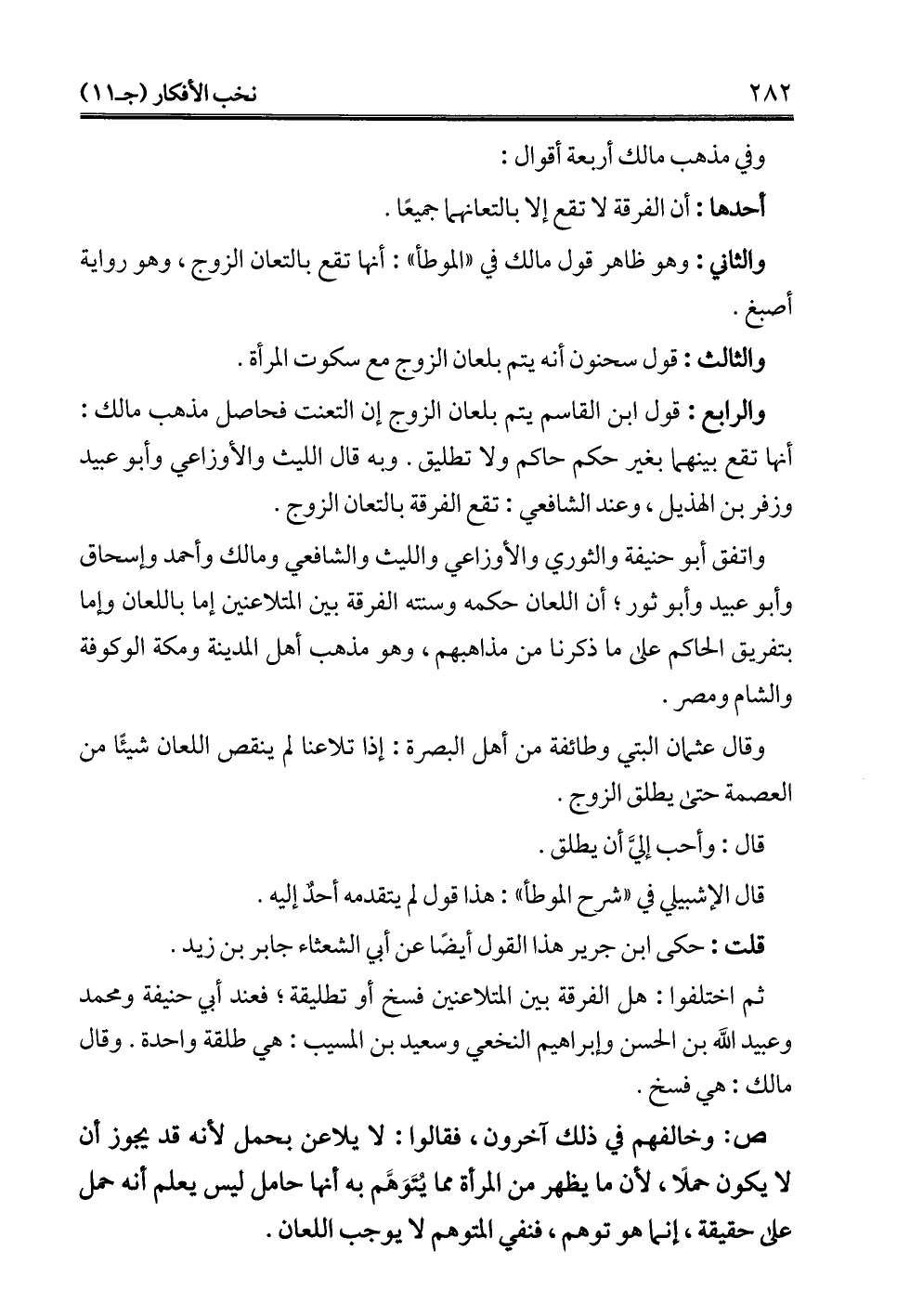 واتفق أبو حنيفة والثوري والأوزاعي والليث والشافعي ومالك وأحمد وإسحاق وأبو عبيد وأبو ثور؛ أن اللعان حكمه وسنته الفرقة بين المتلاعنين إما باللعان وإما بتفريق الحاكم على ما ذكرنا من مذاهبهم، وهو مذهب أهل المدينة ومكة والكوفة والشام ومصر.