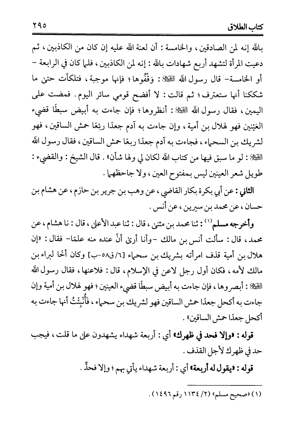 وأخرجه مسلم (¬1): ثنا محمد بن مثنى، قال: ثنا عبد الأعلى، قال: نا هشام، عن محمد، قال: سألت أنس بن مالك -وأنا أرى أنَّ عنده منه علمًا- فقال: "إن هلال بن أمية قذف امرأته بشريك بن سحماء وكان أخًا لبراء بن مالك لأمه، فكان أول رجل لاعن في الإِسلام، قال: فلاعنها، فقال رسول الله -عليه السلام-: أبصروها، فإن جاءت به أبيض سبطًا قضيء العينين؛ فهو لهلال بن أمية وإن جاءت به أكحل جعدًا حمش الساقين فهو لشريك بن سحماء، فَأُنْبِئْتُ أنها جاءت به أكحل جعدًا حمش الساقين".
