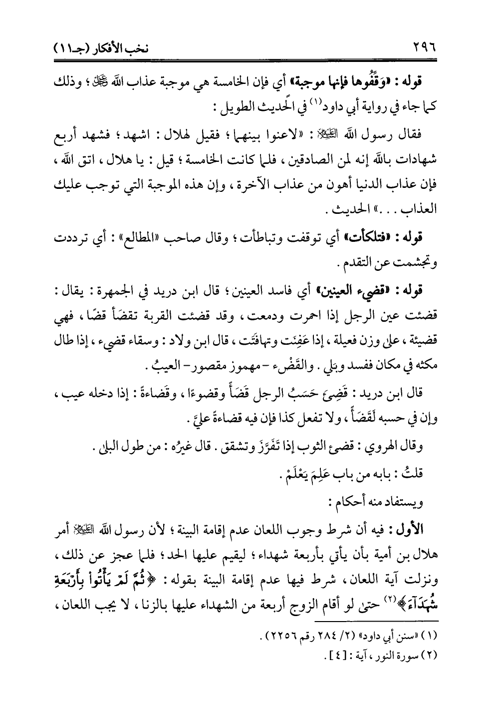 الأول: فيه أن شرط وجوب اللعان عدم إقامة البينة؛ لأن رسول الله -عليه السلام- أمر هلال بن أمية بأن يأتي بأربعة شهداء؛ ليقيم عليها الحد؛ فلما عجز عن ذلك، ونزلت آية اللعان، شرط فيها عدم إقامة البينة بقوله: {ثُمَّ لَمْ يَأْتُوا بِأَرْبَعَةِ شُهَدَاءَ} (¬2) حتى لو أقام الزوج أربعة من الشهداء عليها بالزنا، لا يجب اللعان،