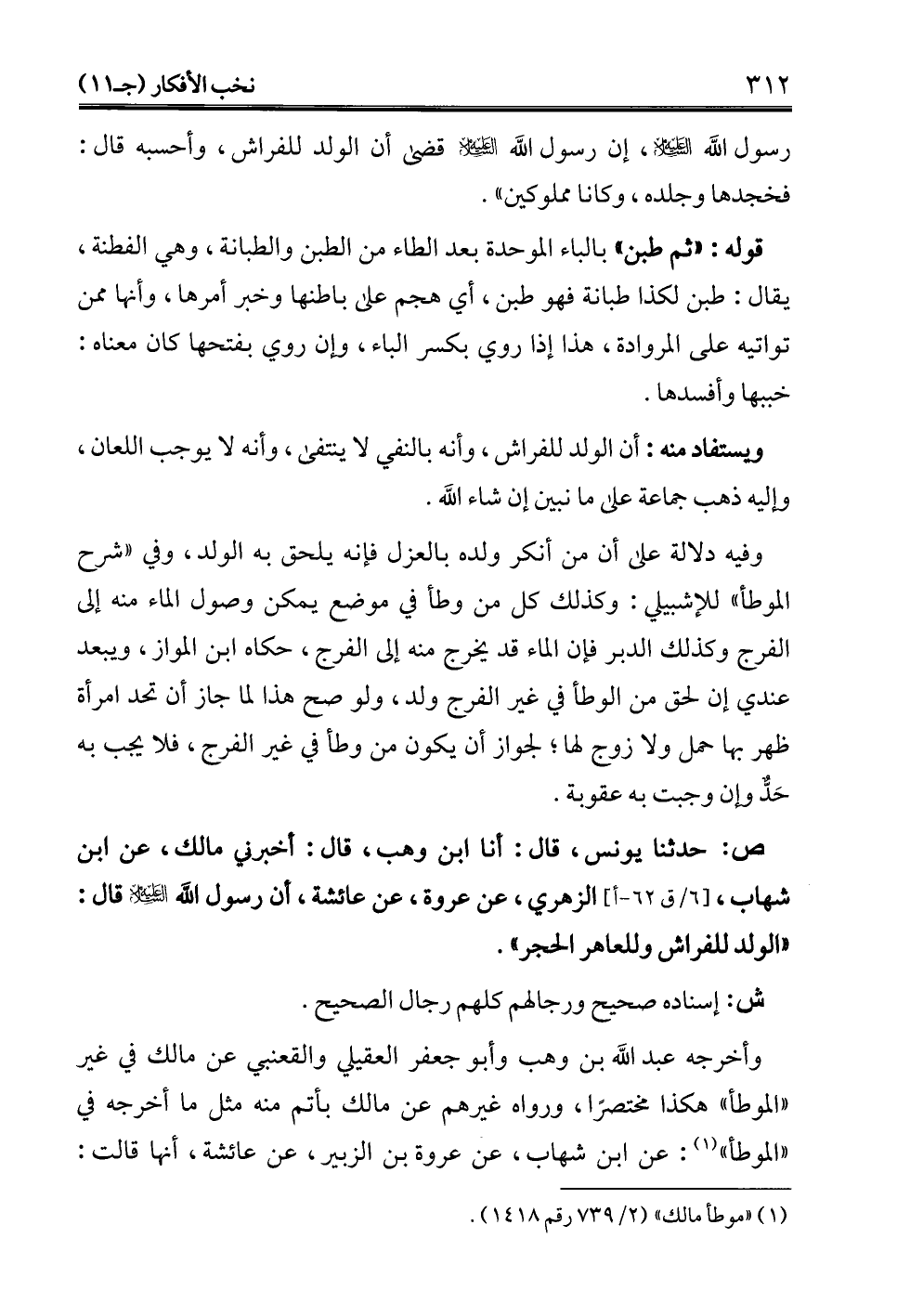 ص: حدثنا يونس، قال: أنا ابن وهب، قال: أخبرني مالك، عن ابن شهاب، الزهري، عن عروة، عن عائشة، أن رسول الله -عليه السلام- قال: "الولد للفراش وللعاهر الحجر".