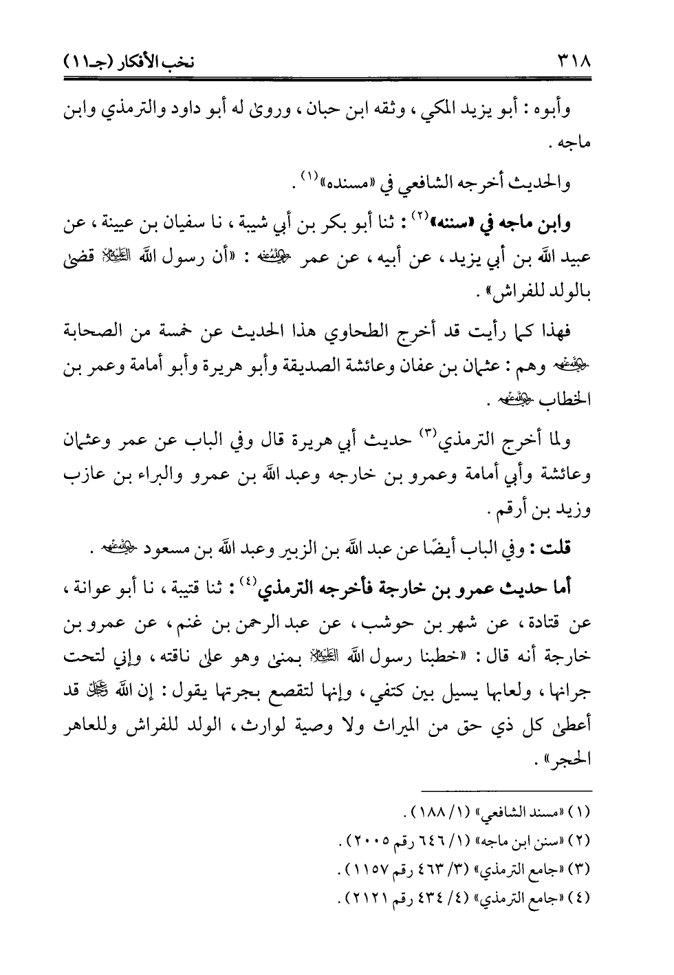 وابن ماجه في "سننه" (¬2): ثنا أبو بكر بن أبي شيبة، نا سفيان بن عيينة، عن عبيد الله بن أبي يزيد، عن أبيه، عن عمر -رضي الله عنه-: "أن رسول الله -عليه السلام- قضى بالولد للفراش".
