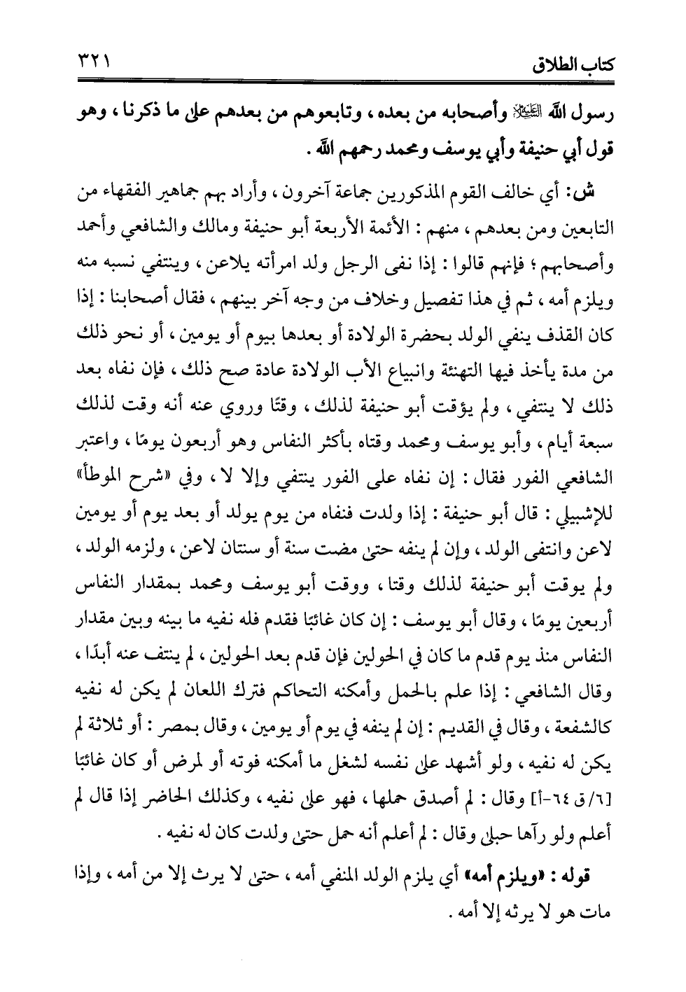 ش: أبي خالف القوم المذكورين جماعة آخرون، وأراد بهم جماهير الفقهاء من التابعين ومن بعدهم، منهم: الأئمة الأربعة أبو حنيفة ومالك والشافعي وأحمد وأصحابهم؛ فإنهم قالوا: إذا نفى الرجل ولد امرأته يلاعن، وينتفي نسبه منه ويلزم أمه، ثم في هذا تفصيل وخلاف من وجه آخر بينهم، فقال أصحابنا: إذا كان القذف ينفي الولد بحضرة الولادة أو بعدها بيوم أو يومين، أو نحو ذلك من مدة يأخذ فيها التهنئة وانبياع الأب الولادة عادة صح ذلك، فإن نفاه بعد ذلك لا ينتفي، ولم يؤقت أبو حنيفة لذلك، وقتًا وروي عنه أنه وقت لذلك سبعة أيام، وأبو يوسف ومحمد وقتاه بأكثر النفاس وهو أربعون يومًا، واعتبر الشافعي الفور فقال: إن نفاه على الفور ينتفي وإلا لا، وفي "شرح الموطأ" للإشبيلي: قال أبو حنيفة: إذا ولدت فنفاه من يوم يولد أو بعد يوم أو يومين لاعن وانتفى الولد، وإن لم ينفه حتى مضت سنة أو سنتان لاعن، ولزمه الولد، ولم يوقت أبو حنيفة لذلك وقتا، ووقت أبو يوسف ومحمد بمقدار النفاس أربعين يومًا، وقال أبو يوسف: إن كان غائبًا فقدم فله نفيه ما بينه وبين مقدار النفاس منذ يوم قدم ما كان في الحولين فإن قدم بعد الحولين، لم ينتف عنه أبدًا، وقال الشافعي: إذا علم بالحمل وأمكنه التحاكم فترك اللعان لم يكن له نفيه كالشفعة، وقال في القديم: إن لم ينفه في يوم أو يومين، وقال بمصر: أو ثلاثة لم يكن له نفيه، ولو أشهد على نفسه لشغل ما أمكنه فوته أو لمرض أو كان غائبًا وقال: لم أصدق حملها، فهو على نفيه، وكذلك الحاضر إذا قال لم أعلم ولو رآها حبلى وقال: لم أعلم أنه حمل حتى ولدت كان له نفيه.