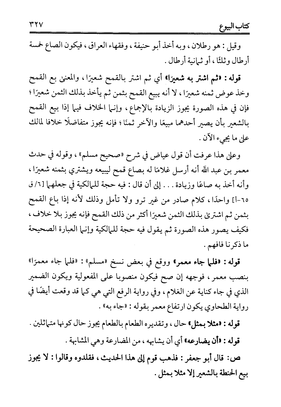 وعلى هذا عرفت أن قول عياض في شرح "صحيح مسلم"، وقوله في حدث معمر بن عبد الله أنه أرسل غلامًا له بصاع قمح ليبيعه ويشتري بثمنه شعيرًا، وأنه أخذ به صاعًا وزيادة ... إلى أن قال: فيه حجة للمالكية في جعلهما واحداً، كلام صادر من غير ترو ولا تأمل وذلك لأنه إذا باع القمح بثمن ثم اشترى بذلك الثمن شعيرًا أكثر من ذلك القمح فإنه يجوز بلا خلاف، فكيف يصور هذه الصورة ثم يقول فيه حجة للمالكية وإنما العبارة الصحيحة ما ذكرنا فافهم.