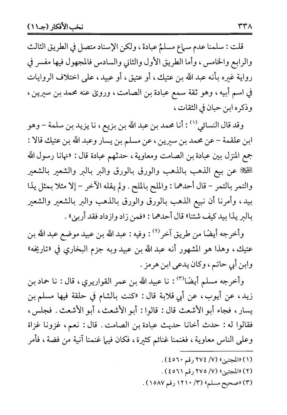 قلت: سلمنا عدم سماع مسلمُ عبادةَ، ولكن الإسناد متصل في الطريق الثالث والرابع والخامس، وأما الطريق الأول والثاني والسادس فالمجهول فيها مفسر في رواية غيره بأنه عبد الله بن عتيك، أو عتيق، أو عبيد، على اختلاف الروايات في اسم أبيه، وهو ثقة سمع عبادة بن الصامت، وروى عنه محمد بن سيرين، وذكره ابن حبان في الثقات.