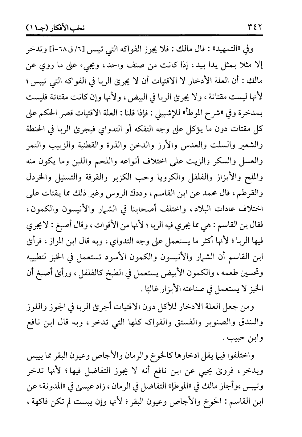 وفي "التمهيد": قال مالك: فلا يجوز الفواكه التي تيبس وتدخر إلا مثلا بمثل يدا بيد، إذا كانت من صنف واحد، ويجيء على ما روي عن مالك: أن العلة الأدخار لا الاقتيات أن لا يجرى الربا في الفواكه التي تيبس؛ لأنها ليست مقتاتة، ولا يجرى الربا في البيض، ولأنها وإن كانت مقتاتة فليست بمدخرة وفي "شرح الموطأ" للإشبيلي: فإذا قلنا: العلة الاقتيات قصر الحكم على كل مقتات دون ما يؤكل على وجه التفكه أو التدواي فيجرى الربا في الحنطة والشعير والسلت والعدس والأرز والدخن والذرة والقطنية والزبيب والتمر والعسل والسكر والزيت على اختلاف أنواعه واللحم واللبن وما يكون منه والملح والأبزاز والفلفل والكرويا وحب الكزبر والقرفة والتسنيل والخردل والقرطم، قال محمد عن ابن القاسم، وددك الروس وغير ذلك مما يقتات على اختلاف عادات البلاد، واختلف أصحابنا في الشمار والأنيسون والكمون، فقال بن القاسم: هي مما يجري فيه الربا؛ لأنها من الأقوات، وقال أصبغ: لا يجري فيها الربا؛ لأنها أكثر ما يستعمل على وجه التدواي، وبه قال ابن المواز، فرأى ابن القاسم أن الشمار والأنيسون والكمون الأسود تستعمل في الخبز لتطييبه وتحسين طعمه، والكمون الأبيض يستعمل في الطبخ كالفلفل، ورأى أصبغ أن الخبز لا يستعمل في صناعته الأبزار غالبًا.