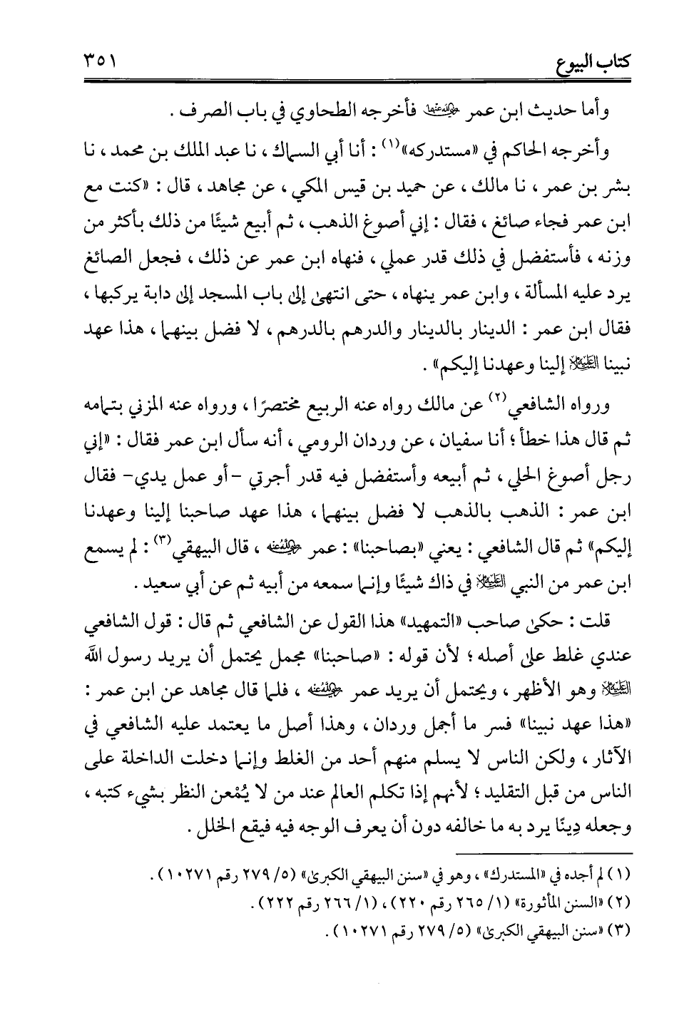 ورواه الشافعي (¬2) عن مالك رواه عنه الربيع مختصرًا، ورواه عنه المزني بتمامه ثم قال هذا خطأ؛ أنا سفيان، عن وردان الرومي، أنه سأل ابن عمر فقال: "إني رجل أصوغ الحلي، ثم أبيعه وأستفضل فيه قدر أجرتي -أو عمل يدي- فقال ابن عمر: الذهب بالذهب لا فضل بينهما، هذا عهد صاحبنا إلينا وعهدنا إليكم" ثم قال الشافعي: يعني "بصاحبنا": عمر -رضي الله عنه-، قال البيهقي (¬3): لم يسمع ابن عمر من النبي -عليه السلام- في ذاك شيئًا وإنما سمعه من أبيه ثم عن أبي سعيد.