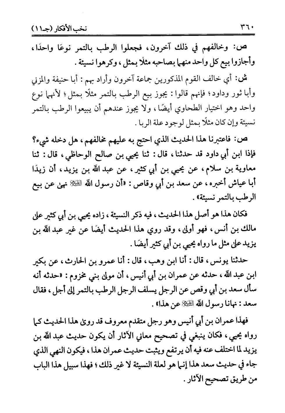 فهذا عمران بن أبي أنيس وهو رجل متقدم معروف قد روى هذا الحديث كما رواه يحيى، فكان ينبغي في تصحيح معاني الآثار أن يكون حديث عبد الله بن يزيد لما اختلف عنه فيه أن يرتفع ويثبت حديث عمران هذا، فيكون النهي الذي جاء في حديث سعد هذا إنما هو لعلة النسيئة لا غير ذلك؛ فهذا سبيل هذا الباب من طريق تصحيح الآثار.