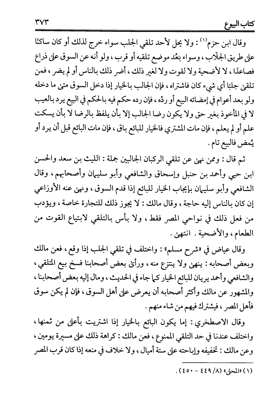 وقال ابن حزم (¬1): ولا يحل لأحد تلقي الجلب سواء خرج لذلك أو كان ساكنًا على طريق الجلّاب، وسواء بَعُد موضع تلقيه أو قرب، ولو أنه عن السوق على ذراع فصاعدًا، لا لأضحية ولا لقوت ولا لغير ذلك، أضر ذلك بالناس أو لم يضر، فمن تلقى جلبًا أي شيء كان فاشتراه، فإن الجالب بالخيار إذا دخل السوق متى ما دخله ولو بعد أعوام في إمضائه البيع أو ردَّه، فإن رده حكم فيه بالحكم في البيع يرد بالعيب لا في المأخوذ بغير حق ولا يكون رضا الجالب إلا بأن يلفظ بالرضا لا بأن يسكت علم أو لم يعلم، فإن مات المشتري فالخيار للبائع باق، فإن مات البائع قبل أن يرد أو يُمض فالبيع تام.