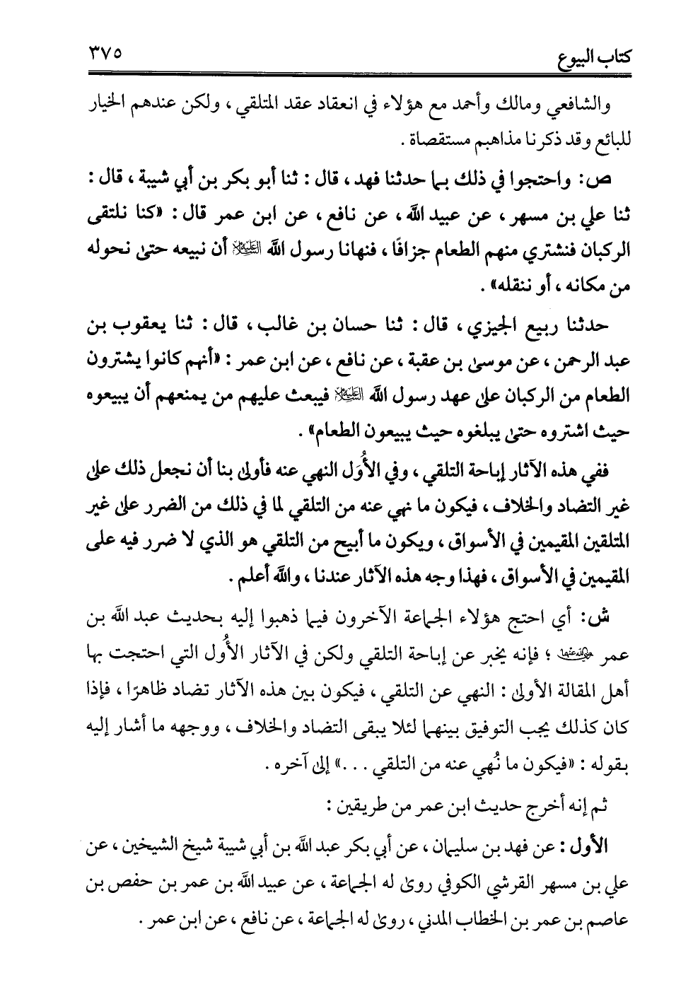 ص: واحتجوا في ذلك بما حدثنا فهد، قال: ثنا أبو بكر بن أبي شيبة، قال: ثنا علي بن مسهر، عن عبيد الله، عن نافع، عن ابن عمر قال: "كنا نلتقى الركبان فنشتري منهم الطعام جزافًا، فنهانا رسول الله -عليه السلام- أن نبيعه حتى نحوله من مكانه، أو ننقله".