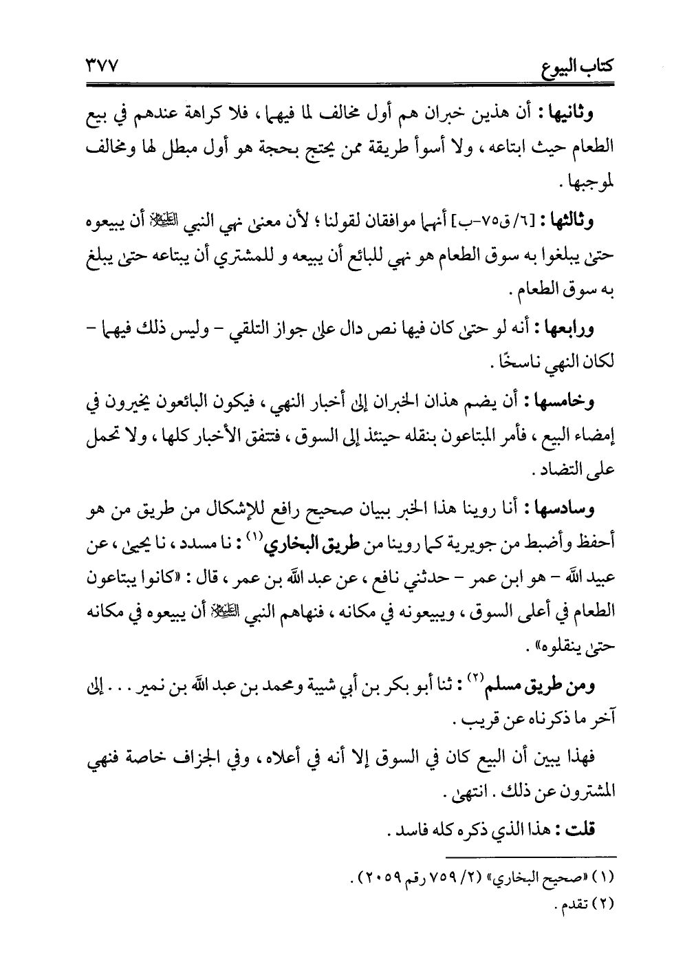وسادسها: أنا روينا هذا الخبر ببيان صحيح رافع للإشكال من طريق من هو أحفظ وأضبط من جويرية كما روينا من طريق البخاري (¬1): نا مسدد، نا يحيى، عن عبيد الله -هو ابن عمر- حدثني نافع، عن عبد الله بن عمر، قال: "كانوا يبتاعون الطعام في أعلى السوق، ويبيعونه في مكانه، فنهاهم النبي -عليه السلام- أن يبيعوه في مكانه حتى ينقلوه".