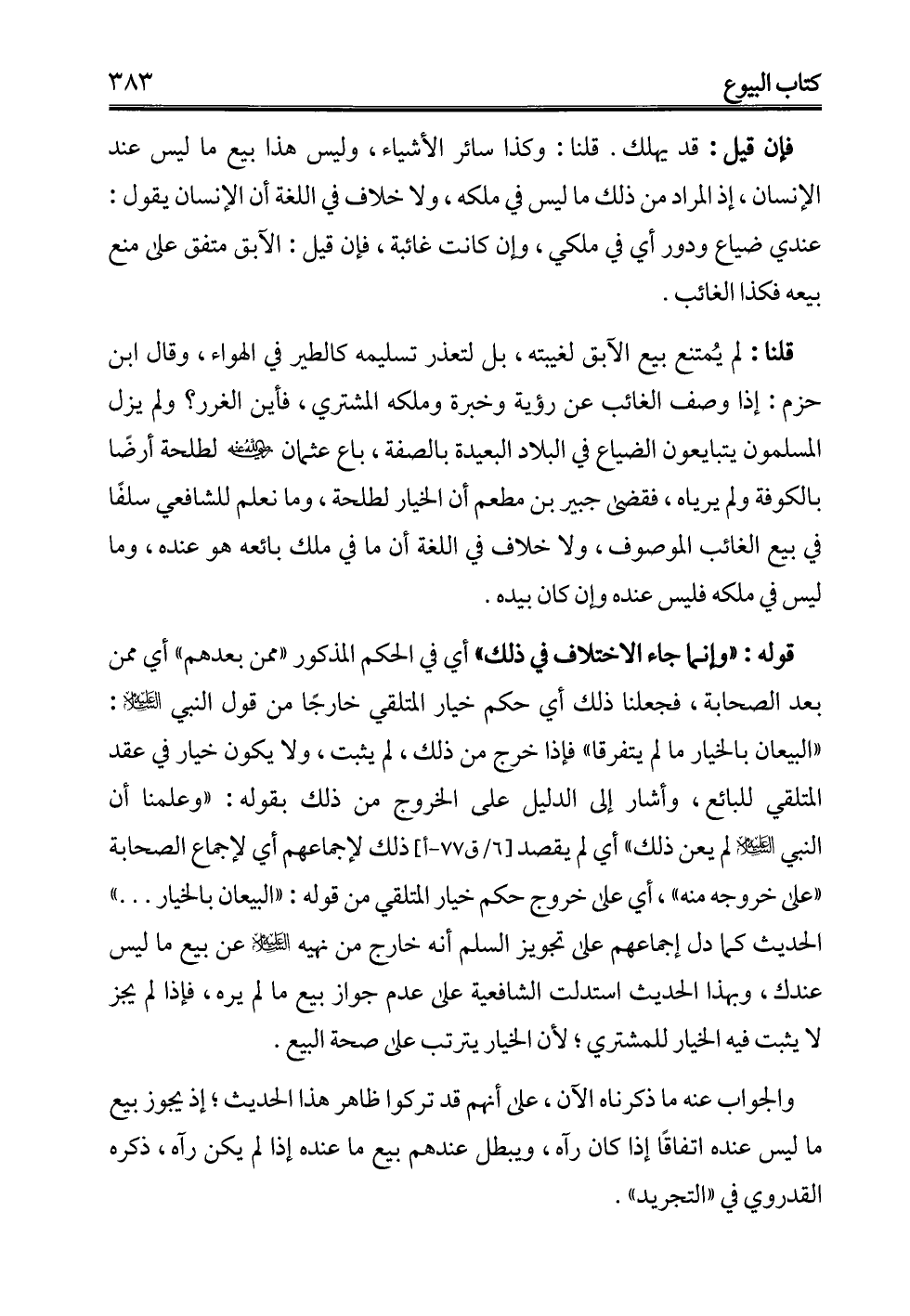 قلنا: لم يُمتنع بيع الآبق لغيبته، بل لتعذر تسليمه كالطير في الهواء، وقال ابن حزم: إذا وصف الغائب عن رؤية وخبرة وملكه المشتري، فأين الغرر؟ ولم يزل المسلمون يتبايعون الضياع في البلاد البعيدة بالصفة، باع عثمان -رضي الله عنه- لطلحة أرضًا بالكوفة ولم يرياه، فقضى جبير بن مطعم أن الخيار لطلحة، وما نعلم للشافعي سلفًا في بيع الغائب الموصوف، ولا خلاف في اللغة أن ما في ملك بائعه هو عنده، وما ليس في ملكه فليس عنده وإن كان بيده.