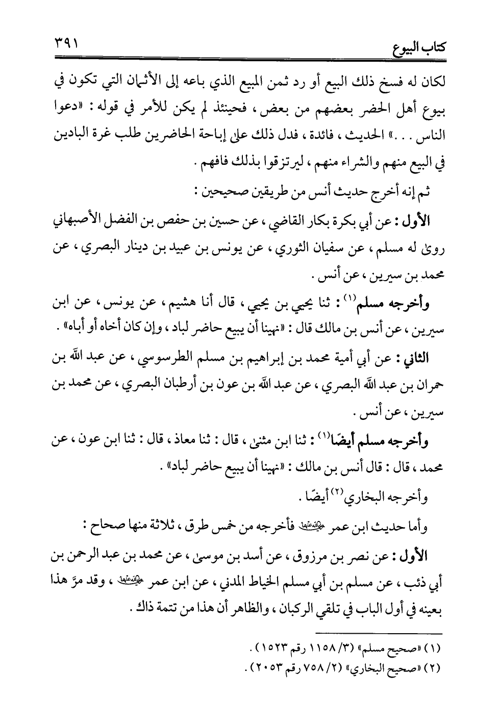 وأخرجه مسلم أيضًا (1): ثنا ابن مثنى، قال: ثنا معاذ، قال: ثنا ابن عون، عن محمد، قال: قال أنس بن مالك: "نهينا أن يبيع حاضر لباد".