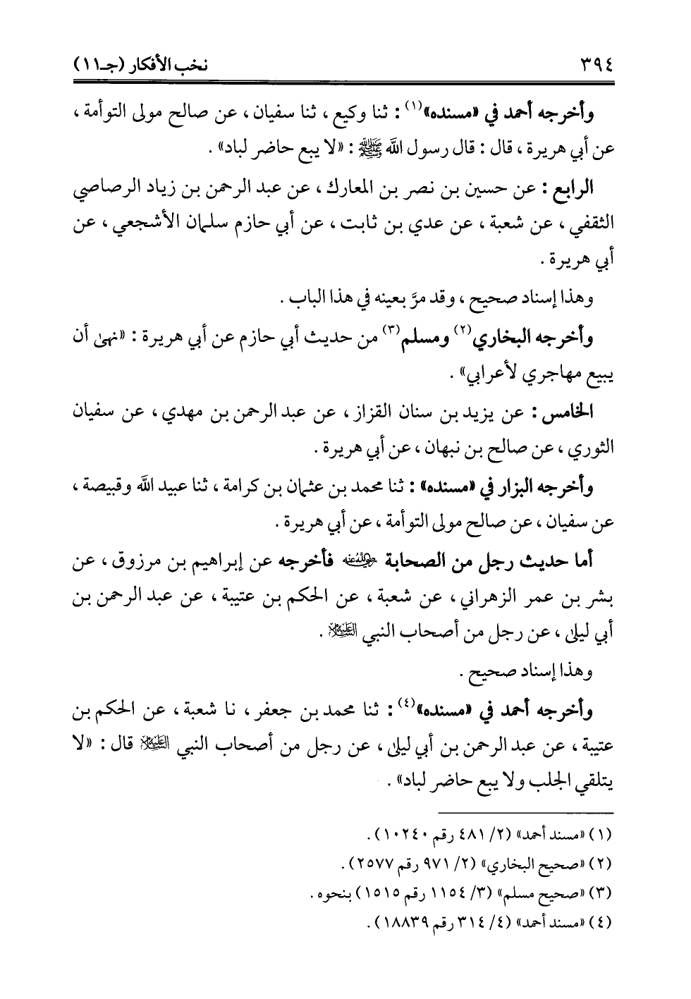 وأخرجه أحمد في "مسنده" (¬1): ثنا وكيع، ثنا سفيان، عن صالح مولى التوأمة، عن أبي هريرة، قال: قال رسول الله - صلى الله عليه وسلم -: "لا يبع حاضر لباد".