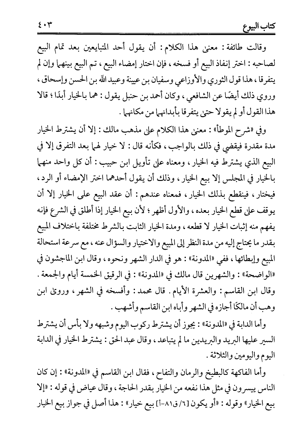 وأما الفاكهة كالبطيخ والرمان والتفاح، فقال ابن القاسم في "المدونة": إن كان الناس ييسرون في مثل هذا نفعه من الخيار بقدر الحاجة، وقال عياض في قوله: "إلا بيع الخيار" وقوله: "أو يكون بيع خيار": هذا أصل في جواز بيع الخيار