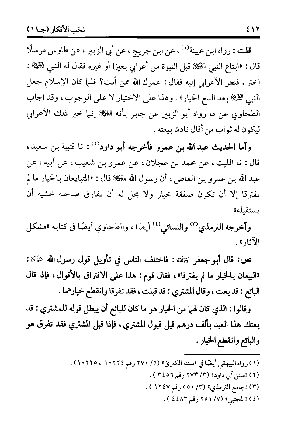 قلت: رواه ابن عيينة (¬1)، عن ابن جريج، عن أبي الزبير، عن طاوس مرسلًا قال: "ابتاع النبي -عليه السلام- قبل النبوة من أعرابي بعيرًا أو غيره فقال له النبي -عليه السلام-: اختر، فنظر الأعرابي إليه فقال: عمرك الله ممن أنت؟ فلما كان الإِسلام جعل النبي -عليه السلام- بعد البيع الخيار". وهذا على الاختيار لا على الوجوب، وقد أجاب الطحاوي عن ما رواه أبو الزبير عن جابر بأنه -عليه السلام- إنما خير ذلك الأعرابي ليكون له ثواب من أقال نادمًا بيعته.