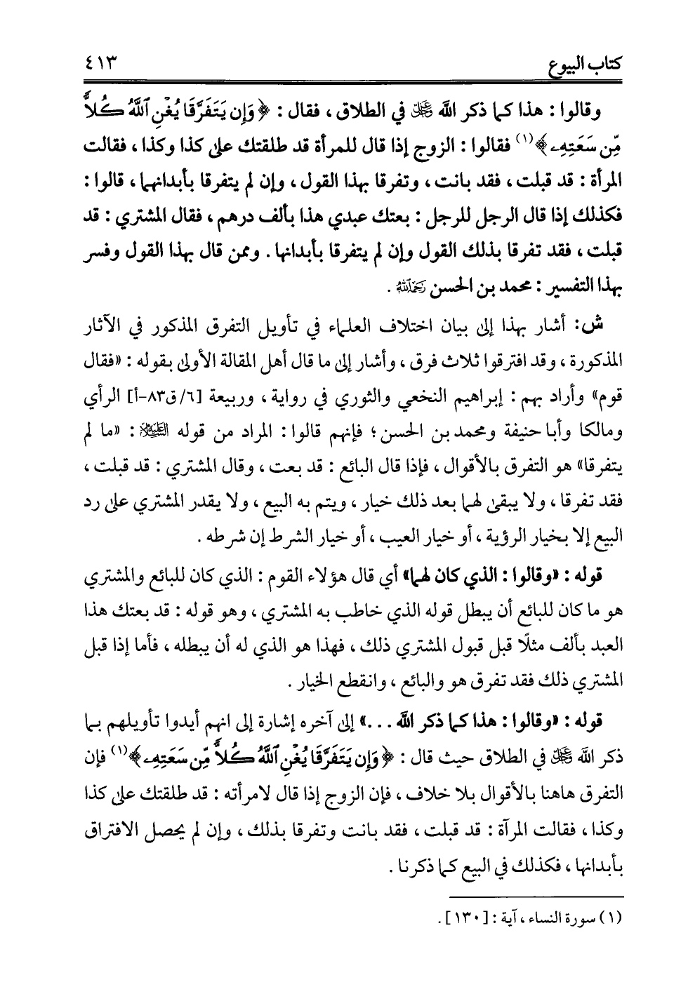 وقالوا: هذا كما ذكر الله -عز وجل- في الطلاق، فقال: {وَإِنْ يَتَفَرَّقَا يُغْنِ اللَّهُ كُلًّا مِنْ سَعَتِهِ} (¬1) فقالوا: الزوج إذا قال للمرأة قد طلقتك على كذا وكذا، فقالت المرأة: قد قبلت، فقد بانت، وتفرقا بهذا القول، وإن لم يتفرقا بأبدانهما، قالوا: فكذلك إذا قال الرجل للرجل: بعتك عبدي هذا بألف درهم، فقال المشتري: قد قبلت، فقد تفرقا بذلك القول وإن لم يتفرقا بأبدانها. وممن قال بهذا القول وفسر بهذا التفسير: محمد بن الحسن -رحمه الله-.