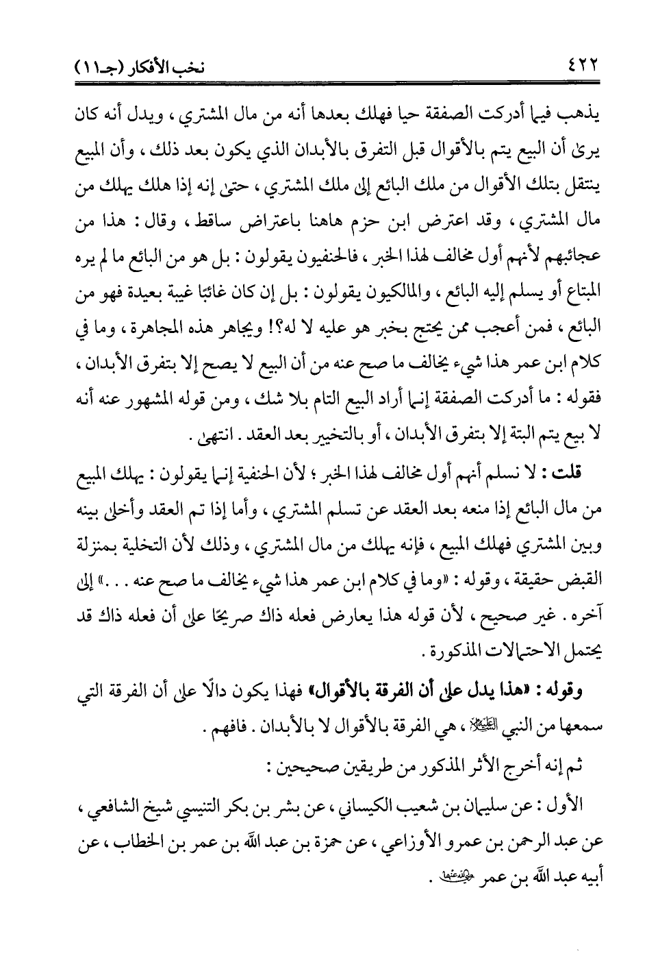 يذهب فيما أدركت الصفقة حيا فهلك بعدها أنه من مال المشتري، ويدل أنه كان يرى أن البيع يتم بالأقوال قبل التفرق بالأبدان الذي يكون بعد ذلك، وأن المبيع ينتقل بتلك الأقوال من ملك البائع إلى ملك المشتري، حتى إنه إذا هلك يهلك من مال المشتري، وقد اعترض ابن حزم ها هنا باعتراض ساقط، وقال: هذا من عجائبهم لأنهم أول مخالف لهذا الخبر، فالحنفيون يقولون: بل هو من البائع ما لم يره المبتاع أو يسلم إليه البائع، والمالكيون يقولون: بل إن كان غائبًا غيبة بعيدة فهو من البائع، فمن أعجب ممن يحتج بخبر هو عليه لا له؟! ويجاهر هذه المجاهرة، وما في كلام ابن عمر هذا شيء يخالف ما صح عنه من أن البيع لا يصح إلا بتفرق الأبدان، فقوله: ما أدركت الصفقة إنما أراد البيع التام بلا شك، ومن قوله المشهور عنه أنه لا بيع يتم البتة إلا بتفرق الأبدان، أو بالتخيير بعد العقد. انتهى.