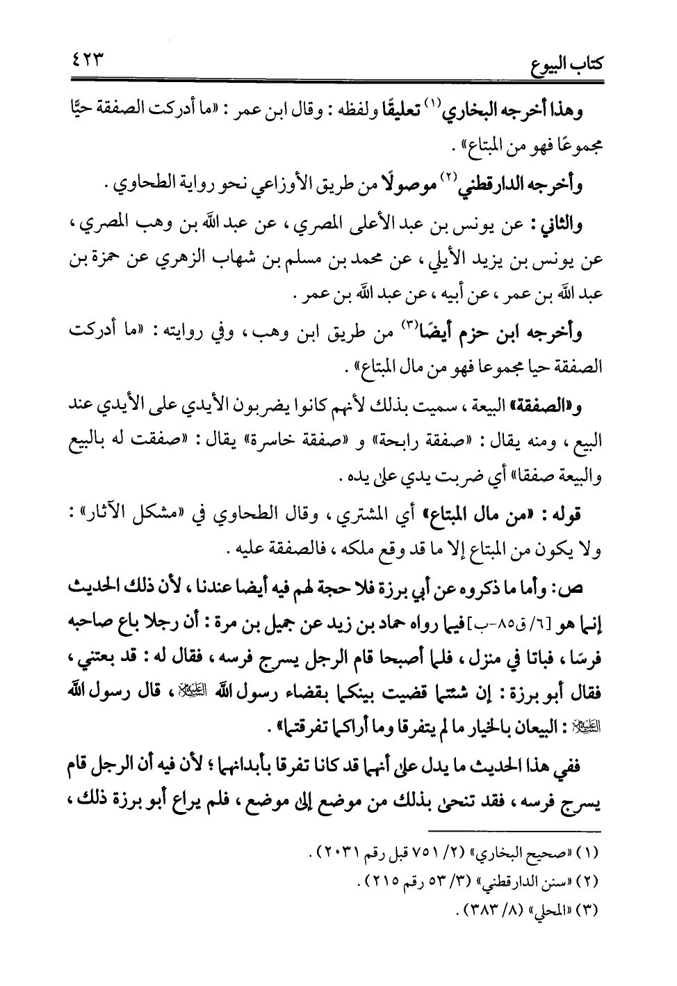 وأخرجه ابن حزم أيضًا (¬3) من طريق ابن وهب، وفي روايته: "ما أدركت الصفقة حيا مجموعا فهو من مال المبتاع".