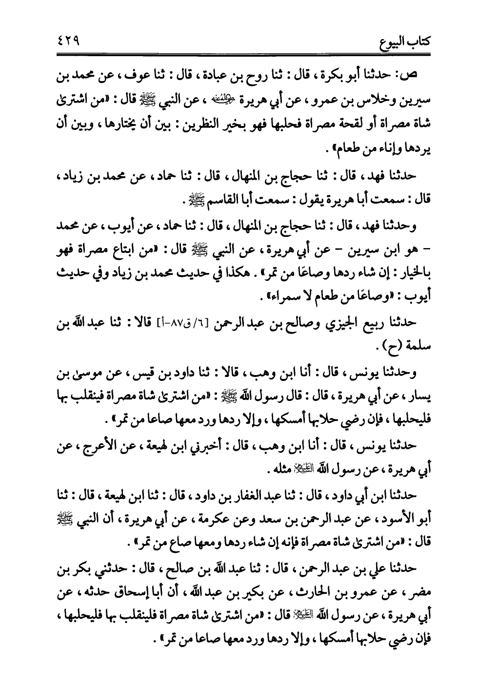 وحدثنا فهد، قال: ثنا حجاج بن المنهال، قال: ثنا حماد، عن أيوب، عن محمد -هو ابن سيرين- عن أبي هريرة، عن النبي - صلى الله عليه وسلم - قال: "من ابتاع مصراة فهو بالخيار: إن شاء ردها وصاعًا من تمر". هكذا في حديث محمد بن زياد وفي حديث أيوب: "وصاعًا من طعام لا سمراء".
