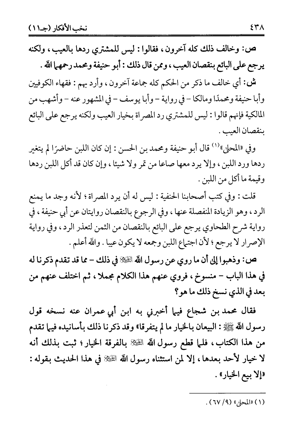 ش: أي خالف ما ذكر من الحكم كله جماعة آخرون، وأرد بهم: فقهاء الكوفيين وأبا حنيفة ومحمدًا ومالكا -في رواية- وأبا يوسف -في المشهور عنه- وأشهب من المالكية فإنهم قالوا: ليس للمشتري رد المصراة بخيار العيب ولكنه يرجع على البائع بنقصان العيب.