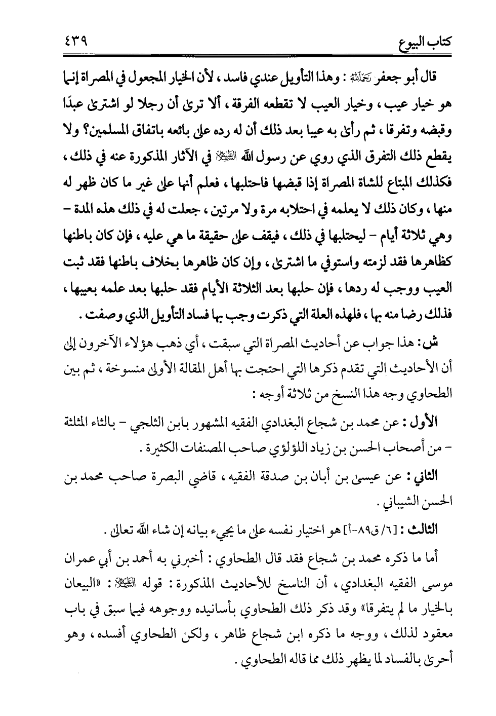 ش: هذا جواب عن أحاديث المصراة التي سبقت، أي ذهب هؤلاء الآخرون إلى أن الأحاديث التي تقدم ذكرها التي احتجت بها أهل المقالة الأولى منسوخة، ثم بين الطحاوي وجه هذا النسخ من ثلاثة أوجه: