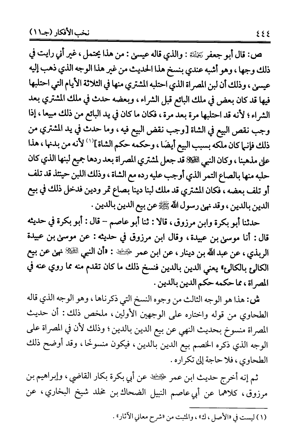 ص: قال أبو جعفر -رحمه الله-: والذي قاله عيسى: من هذا يحتمل، غير أني رأيت في ذلك وجها، وهو أشبه عندي بنسخ هذا الحديث من غير هذا الوجه الذي ذهب إليه عيسى، وذلك أن لبن المصراة الذي احتلبه المشتري منها في الثلاثة الأيام التي احتلبها فيها قد كان بعض في ملك البائع قبل الشراء، وبعضه حدث في ملك المشتري بعد الشراء؛ لأنه قد احتلبها مرة بعد مرة، فكان ما كان في يد البائع من ذلك مبيعا، إذا وجب نقص البيع في الشاة [وجب نقض البيع فيه، وما حدث في يد المشتري من ذلك فإنما كان ملكه بسبب البيع أيضًا، وحكمه حكم الشاة] (¬1) لأنه من بدنها، هذا على مذهبنا، وكان النبي -عليه السلام- قد جعل لمشتري المصراة بعد ردها جميع لبنها الذي كان حلبه منها بالصاع التمر الذي أوجب عليه رده مع الشاة، وذلك اللبن حينئذ قد تلف أو تلف بعضه، فكان المشتري قد ملك لبنا دينا بصاع تمر ودين فدخل ذلك في بيع الدين بالدين، وقد نهى رسول الله - صلى الله عليه وسلم - عن بيع الدين بالدين.