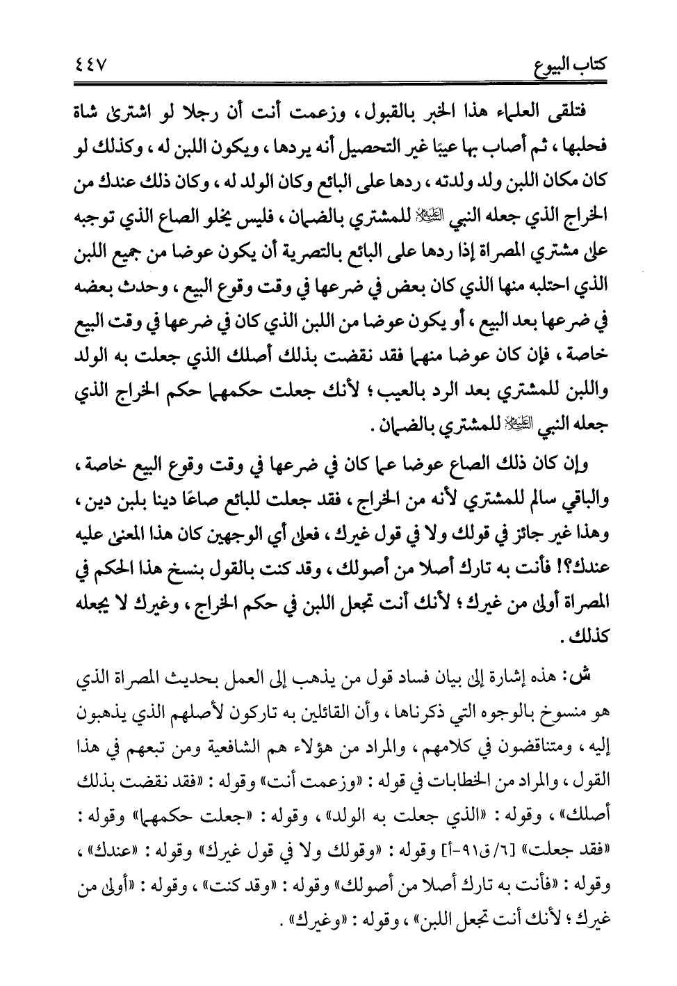 فتلقى العلماء هذا الخبر بالقبول، وزعمت أنت أن رجلا لو اشترى شاة فحلبها، ثم أصاب بها عيبًا غير التحصيل أنه يردها، ويكون اللبن له، وكذلك لو كان مكان اللبن ولد ولدته، ردها على البائع وكان الولد له، وكان ذلك عندك من الخراج الذي جعله النبي -عليه السلام- للمشتري بالضمان، فليس يخلو الصاع الذي توجبه على مشتري المصراة إذا ردها على البائع بالتصرية أن يكون عوضا من جميع اللبن الذي احتلبه منها الذي كان بعض في ضرعها في وقت وقوع البيع، وحدث بعضه في ضرعها بعد البيع، أو يكون عوضا من اللبن الذي كان في ضرعها في وقت البيع خاصة، فإن كان عوضا منهما فقد نقضت بذلك أصلك الذي جعلت به الولد واللبن للمشتري بعد الرد بالعيب؛ لأنك جعلت حكمهما حكم الخراج الذي جعله النبي -عليه السلام- للمشتري بالضمان.