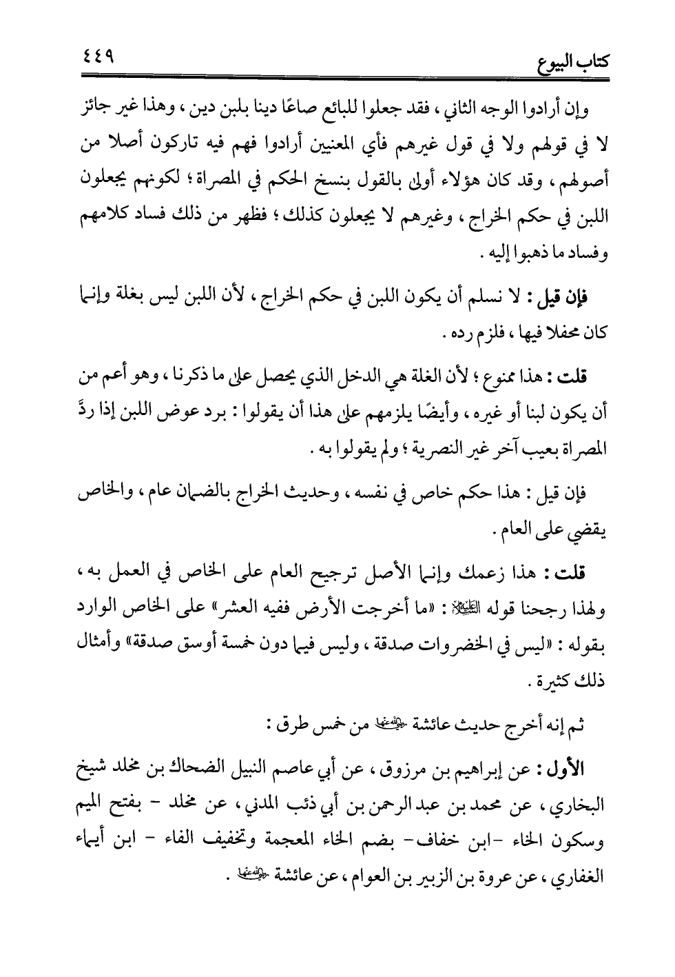 وإن أرادوا الوجه الثاني، فقد جعلوا للبائع صاعًا دينا بلبن دين، وهذا غير جائز لا في قولهم ولا في قول غيرهم فأي المعنيين أرادوا فهم فيه تاركون أصلاً من أصولهم، وقد كان هؤلاء أولى بالقول بنسخ الحكم في المصراة؛ لكونهم يجعلون اللبن في حكم الخراج، وغيرهم لا يجعلون كذلك؛ فظهر من ذلك فساد كلامهم وفساد ما ذهبوا إليه.