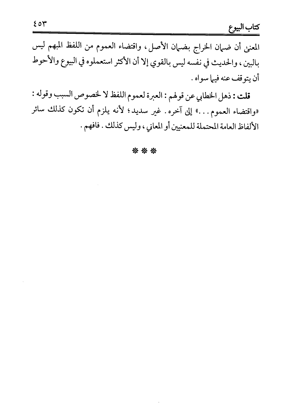 قلت: ذهل الخطابي عن قولهم: العبرة لعموم اللفظ لا لخصوص السبب وقوله: "واقتضاء العموم ... " إلى آخره. غير سديد؛ لأنه يلزم أن تكون كذلك سائر الألفاظ العامة المحتملة للمعنيين أو المعاني، وليس كذلك. فافهم.