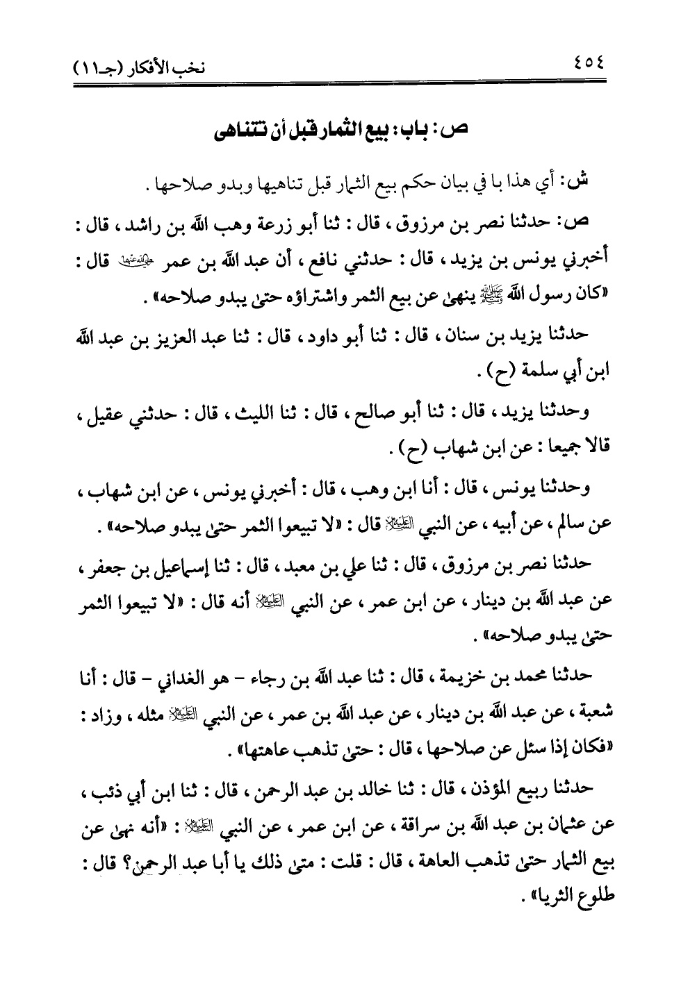 ص: حدثنا نصر بن مرزوق، قال: ثنا أبو زرعة وهب الله بن راشد، قال: أخبرني يونس بن يزيد، قال: حدثني نافع، أن عبد الله بن عمر -رضي الله عنهما- قال: "كان رسول الله - صلى الله عليه وسلم - ينهى عن بيع الثمر واشتراؤه حتى يبدو صلاحه".