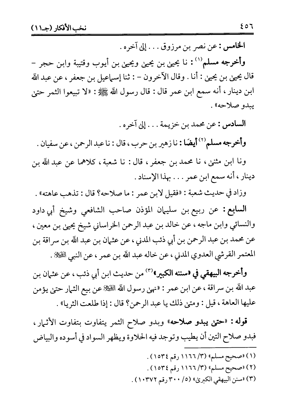 وأخرجه مسلم (¬1): نا يحيى بن يحيى ويحيى بن أيوب وقتيبة وابن حجر -قال يحيى بن يحيى: أنا. وقال الآخرون-: ثنا إسماعيل بن جعفر، عن عبد الله ابن دينار، أنه سمع ابن عمر قال: قال رسول الله - صلى الله عليه وسلم -: "لا تبيعوا الثمر حتى يبدو صلاحه".
